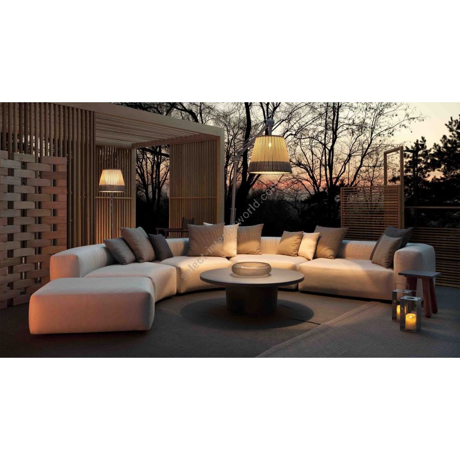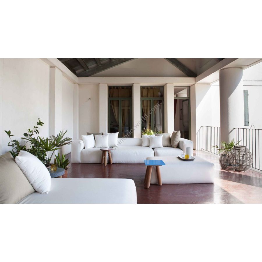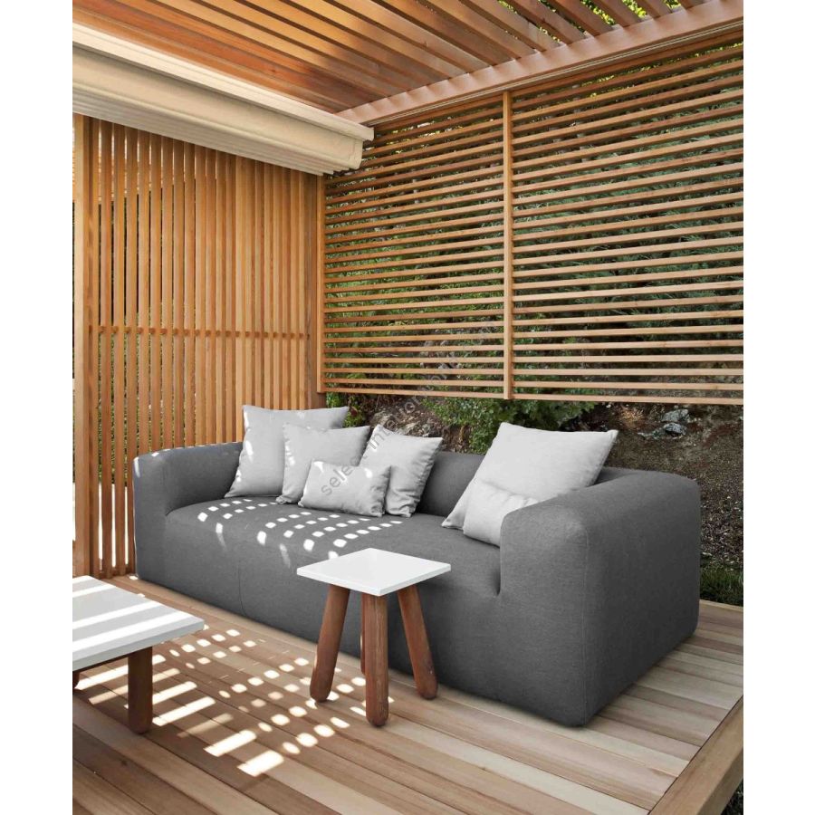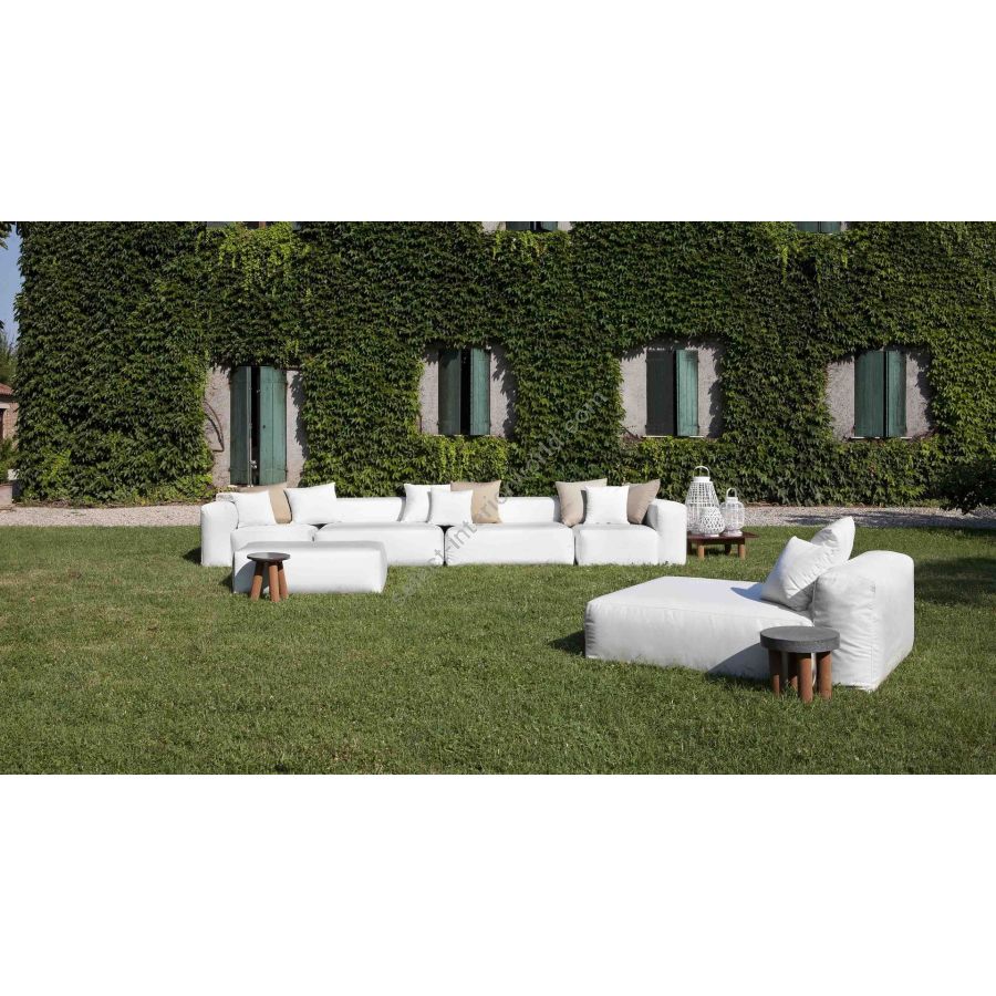 Gli ampi volumi portano all’esterno il comfort di un’imbottitura dedicata solitamente all’arredamento d’interni. La seduta monolitica, senza gambe, rende il divano un continuum per regalare un’esperienza di seduta ancora più morbida e rilassante.
