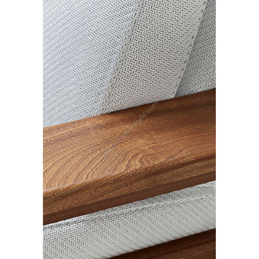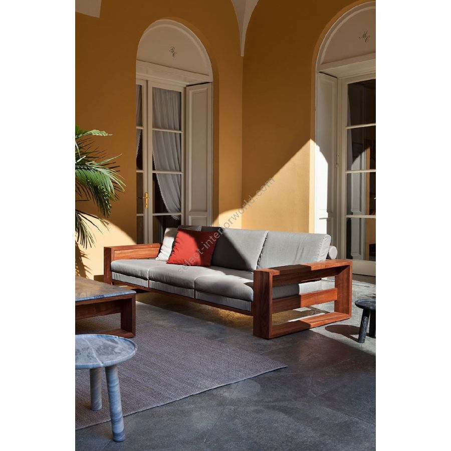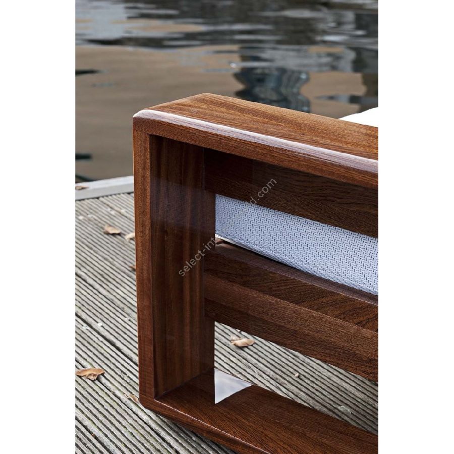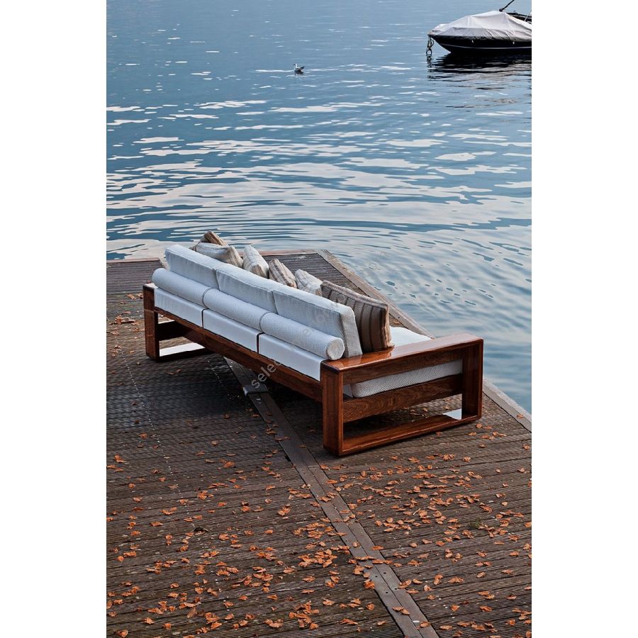 Geometrie rigorose e materiali pregiati: la Collezione Bellagio è un chiaro omaggio a un design maestoso, in grado di caratterizzare con una forte identità ogni ambiente. La struttura a cellula chiusa è interamente realizzata in mogano Sapelli e rivestita in tessuto nautico, disponibile in ogni colore come da campionario.