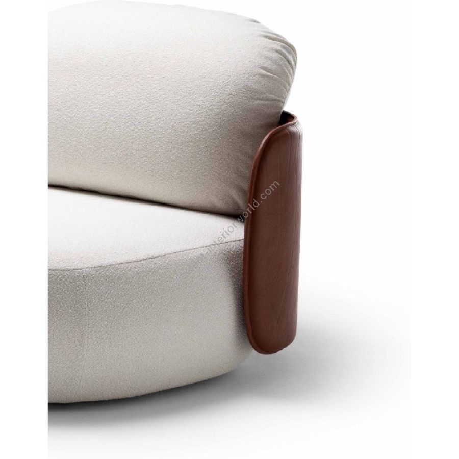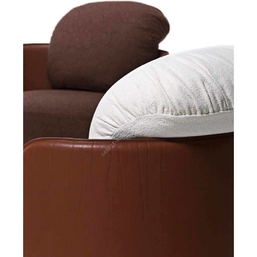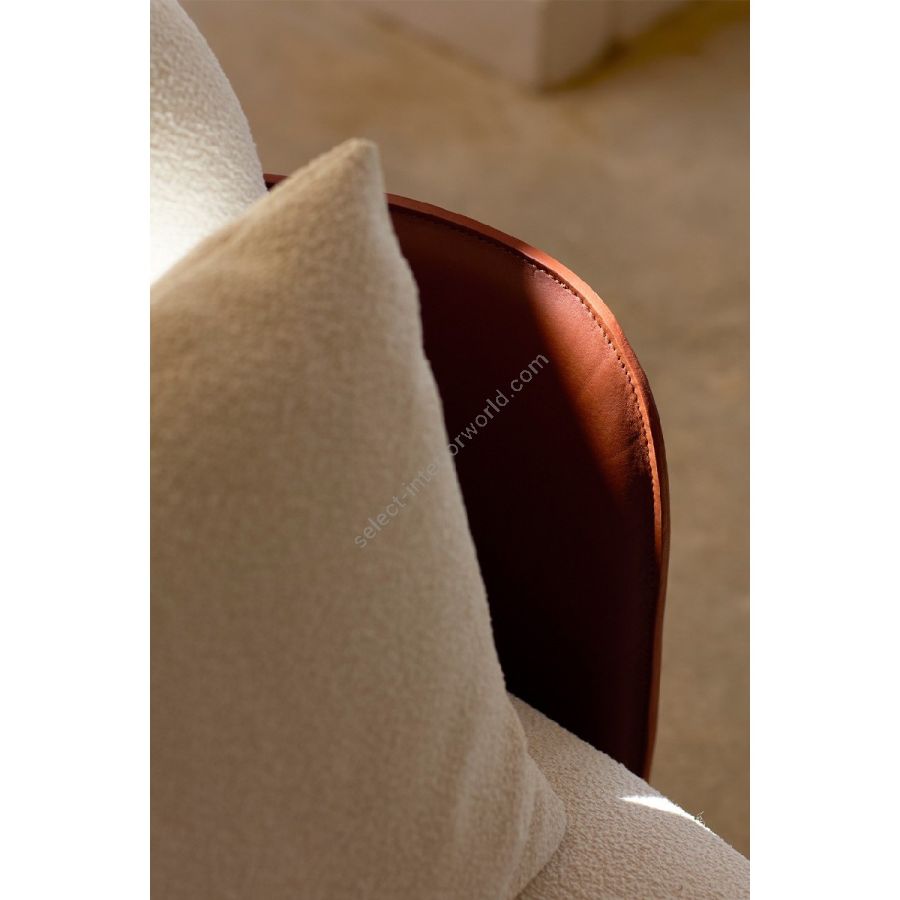 Lo schienale rigido in cuoio accoglie i volumi soffici della seduta e dei cuscini, in un abbraccio che esalta una visione giocosa e allo stesso tempo sofisticata del design.