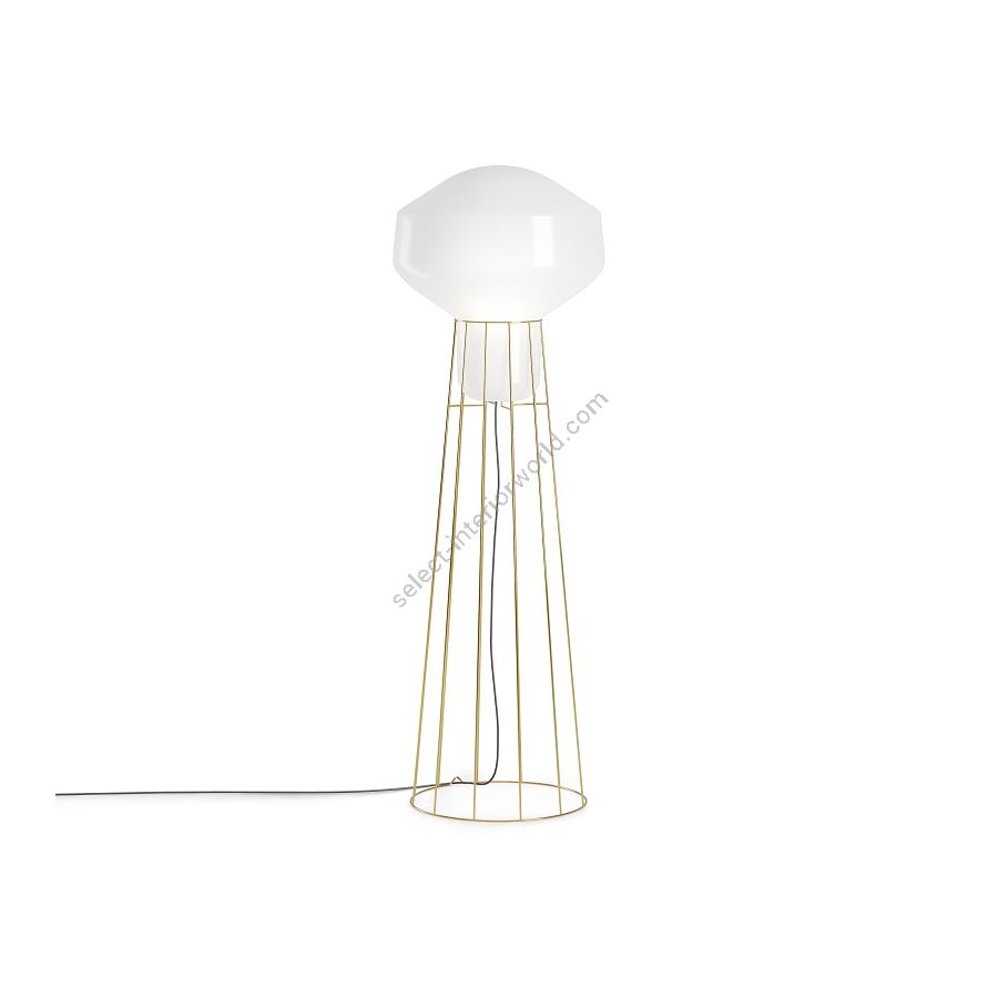 Floor lamp with shiny white blown glass diffuser and brass-plated metal structure.