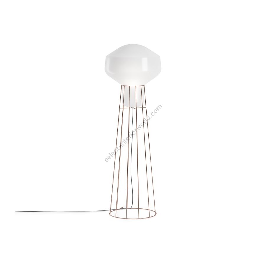 The Aérostat collection is composed of indoors hanging, table and floor lamps. Hanging and table lamps are available in two diffuser sizes with a metal cage acting as support, while the floor lamp is available in one size only. All diffusers are in shiny white blown glass whereas the metal cages are in brass, black chrome and copper finish, all shiny. Electrification on main voltage for LED bulbs.