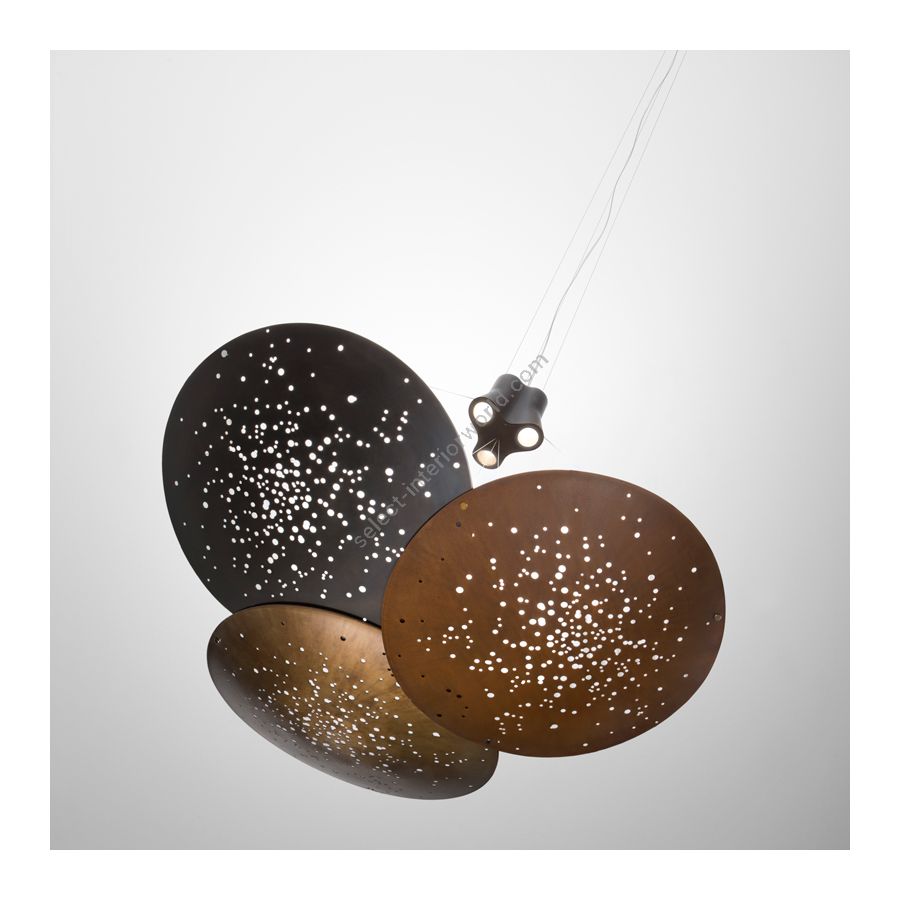 Pendant lamp with black aluminium structure and iron lens. The lens undergoes an oxidation process inducted by flame and it is followed by brushing, sponging, polishing and sanding.