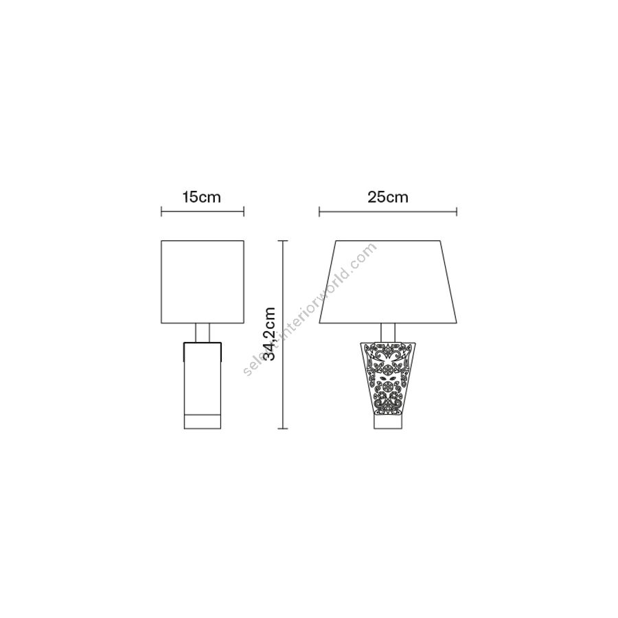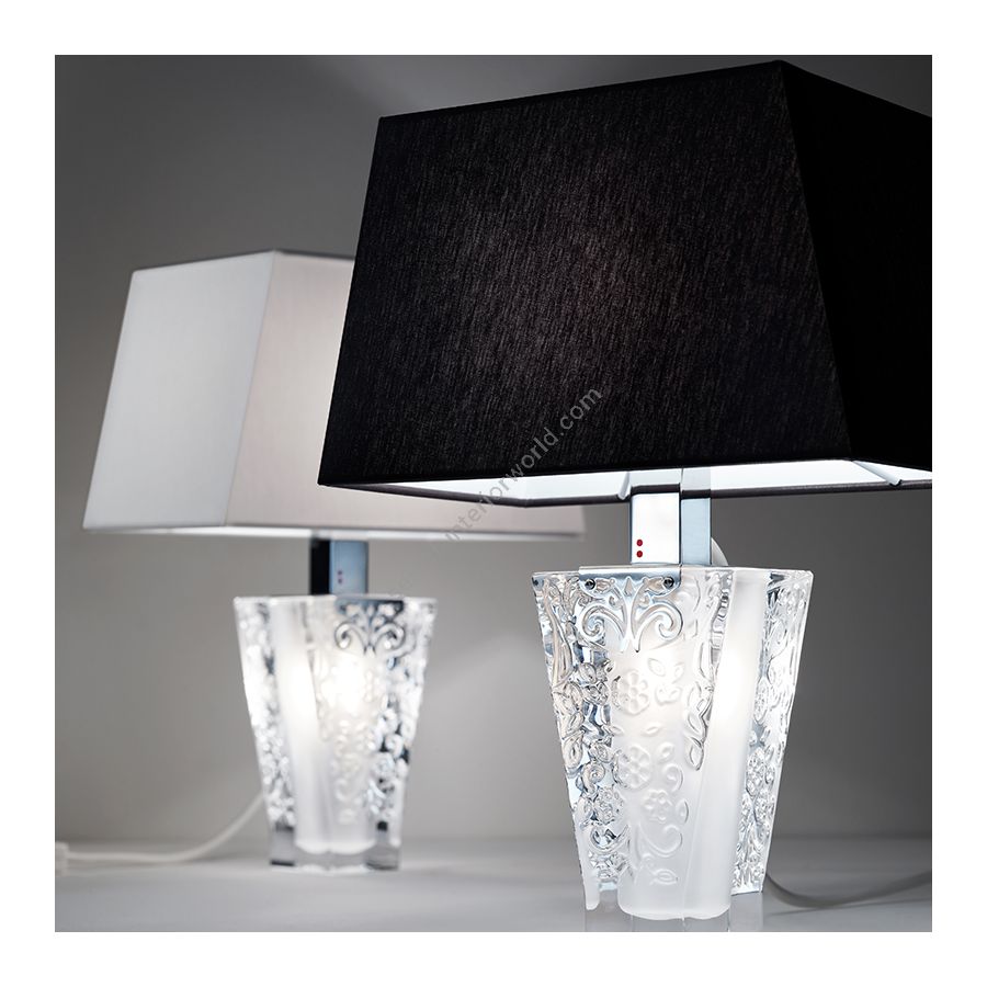 Table lamp with crystal diffusers and fabric lampshade. Polished chrome-plated finishes. Equipped with a double source of light.