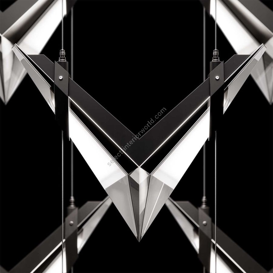 Inspired by the bold geometry of chevron shapes and the sleek lines of modern aircraft, Blade brings a sense of motion and precision to lighting design and merges sleek design with modern functionality. Pendant features cut crystal and integrated LEDs in Standard Black Iron or Champagne finish. Dark Walnut stained wood featured on select items adding warmth to the metal forms.