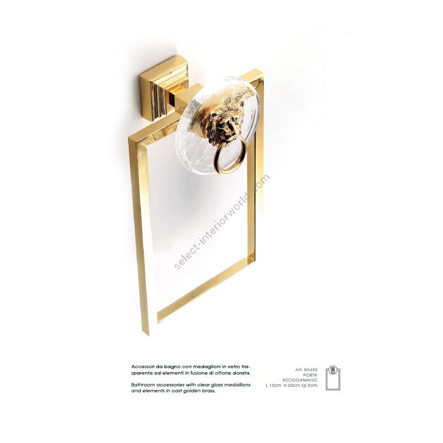 Square Towel holder in polished gold with casting brass Lion and glass medallion. Functional elements that create an extremely elegant, welcoming and high-value bathroom.