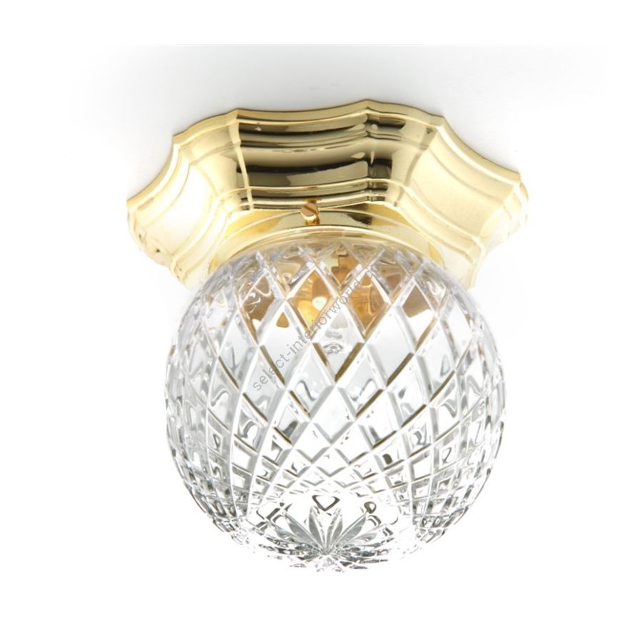 Ceiling brass with crystal. Lighting item that diffuses the light with great effect in the surrounding environement creating a warm and welcoming atmosphere.
