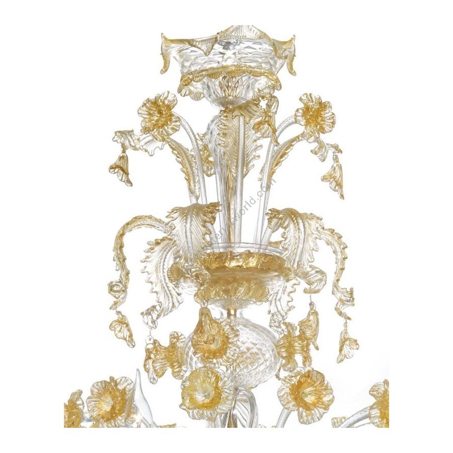 Murano Glass chandelier transparent with Gold decoration. Lighting item that diffuses the light with great effect in the surrounding environement creating a warm and welcoming atmosphere.