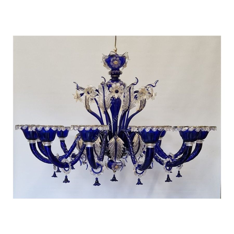 A stunning Murano chandelier in deep blue with transparent gold decorations is an extraordinary work of art. Hand-blown glass takes intricate and detailed forms, while the deep blue captures the gaze, creating an atmosphere of mystery and luxury. The golden decorations, crafted with gold leaf or golden pigments, add a touch of elegance. This chandelier diffuses a magical light, transforming any space into a place of wonder and admiration.