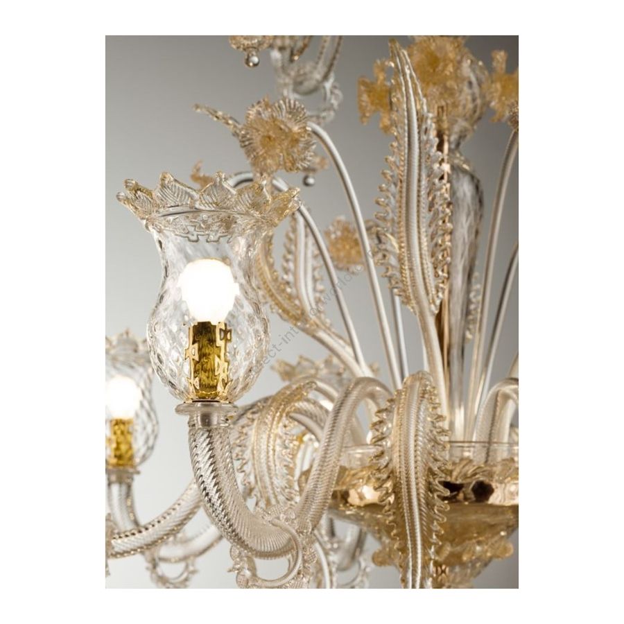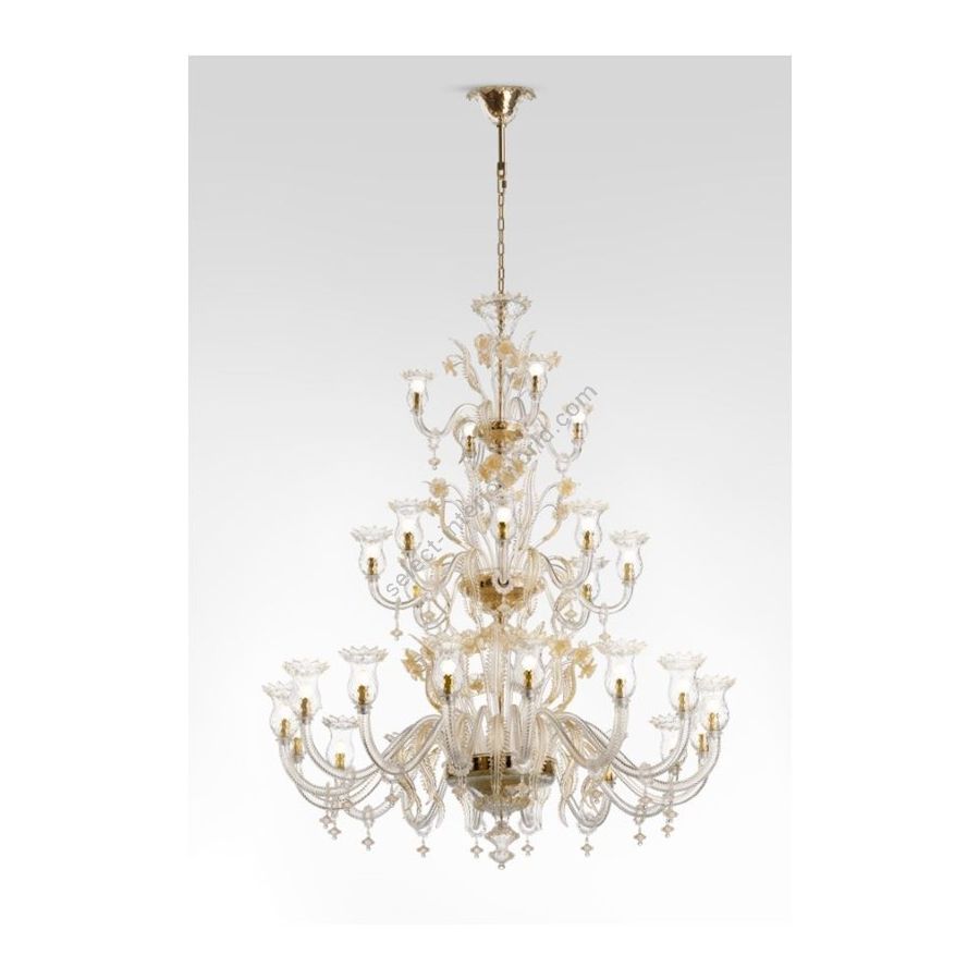 28 lights 3 tier Murano Glass chandelier clear with gold decorations. Lighting item that diffuses the light with great effect in the surrounding environement creating a warm and welcoming atmosphere.