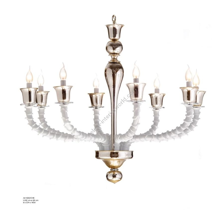 8 lights Chandelier in Murano glass with mirror effect. Lighting item that diffuses the light with great effect in the surrounding environement creating a warm and welcoming atmosphere.