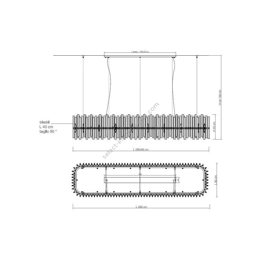 Chandelier with transparent trihedron glasses - wood case included. Lighting item that diffuses the light with great effect in the surrounding environement creating a warm and welcoming atmosphere.