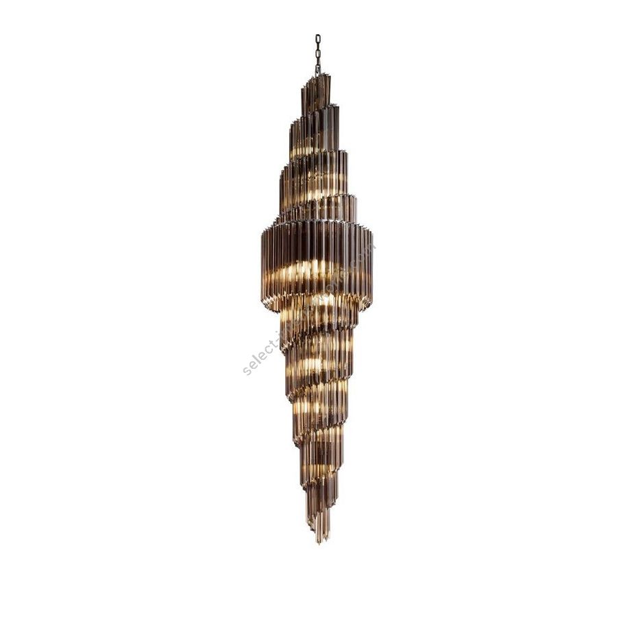 Round chadelier with smoky/chocolate color quadrangular glass. Lighting item that diffuses the light with great effect in the surrounding environement creating a warm and welcoming atmosphere.