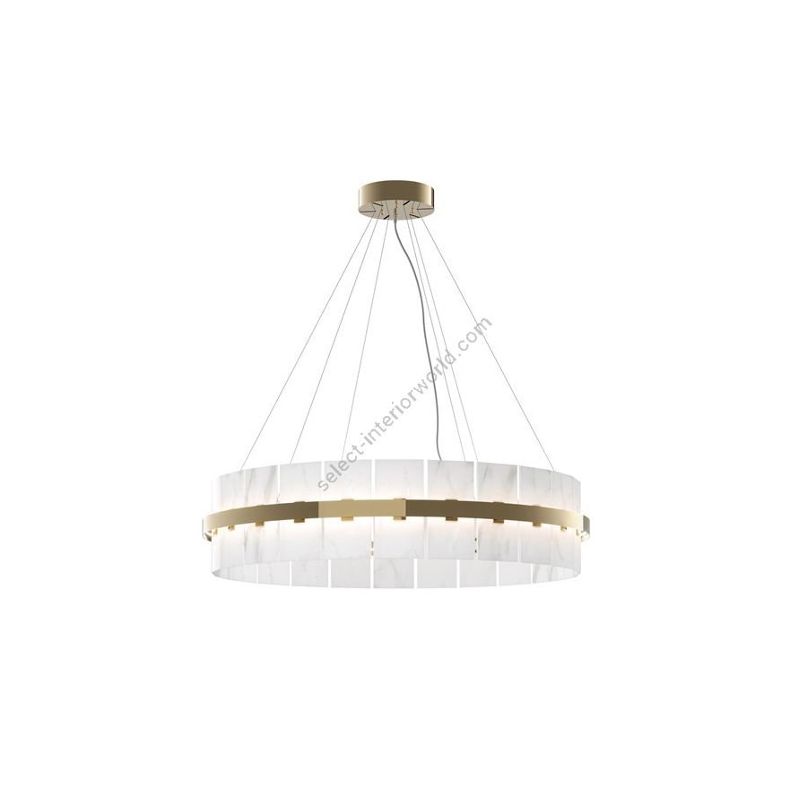Round chandelier in brass with Carrara marble tiles. Lighting item that diffuses the light with great effect in the surrounding environement creating a warm and welcoming atmosphere.