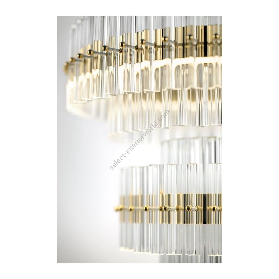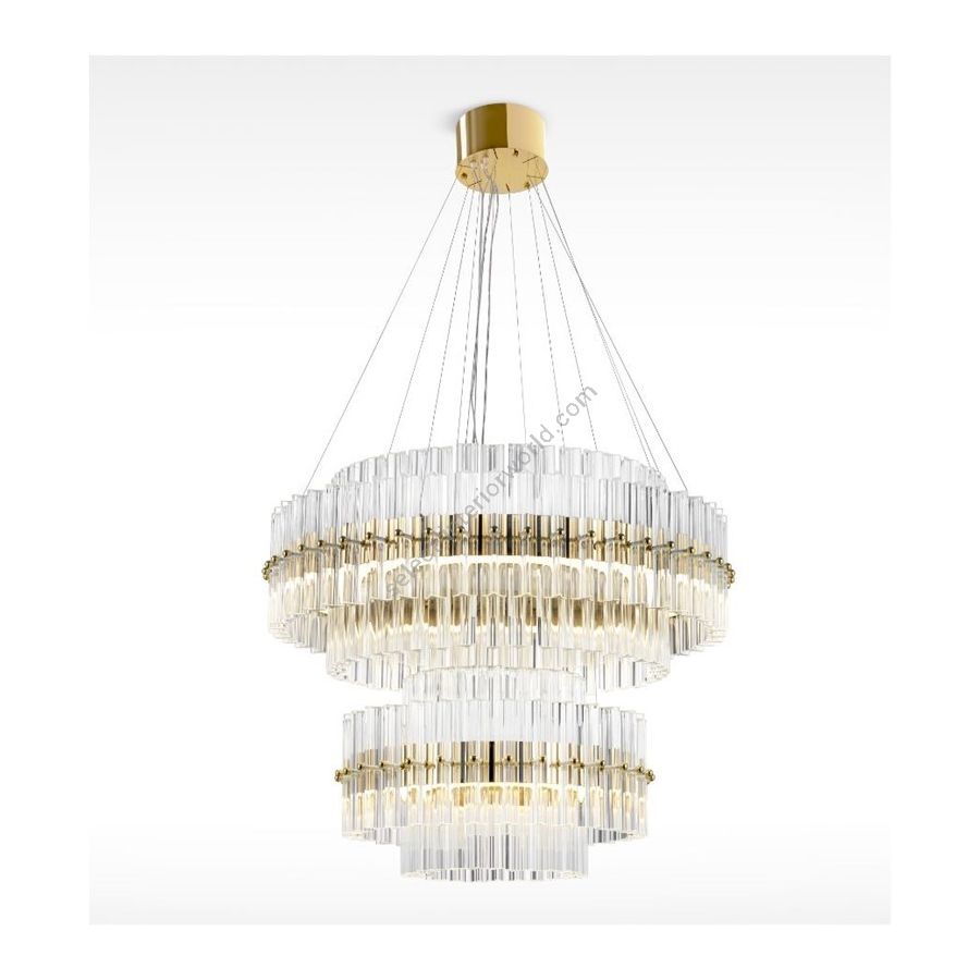 Coronis Chandelier A contemporary expression of timeless elegance and radiant light. The Coronis Chandelier embodies the perfect harmony between geometric precision and material refinement, designed for luxurious interiors such as living rooms, dining areas, and grand entrance halls. Its metal structure, enhanced by a 24K gold-plated galvanic finish, supports two luminous rings adorned with transparent glass trihedrons, each precisely cut at a 90° angle. These glass elements reflect and refract light, creating a mesmerizing interplay of brilliance and transparency that fills the space with elegance and airiness. The integrated high-efficiency LED strips diffuse a soft yet vibrant light along the circular frames, amplifying the purity of the glass and the warmth of gold. The result is a refined and enveloping glow, turning every setting into a scene of understated opulence. With a diameter of 60 cm and a height of 50 cm, Coronis combines harmonious proportions and scenic impact. Adjustable suspension cables allow for customized installation, while the dual luminous rings enhance architectural spaces with balance and sophistication. A true jewel of light, uniting glass artistry, Italian craftsmanship, and contemporary design in a perfect symphony of luxury and lightness.