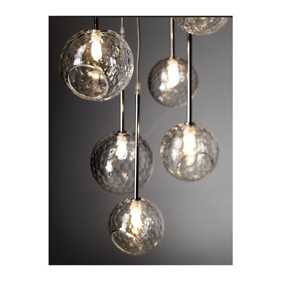 Cascade chandelier with clear crystal balls. Lighting item that diffuses the light with great effect in the surrounding environement creating a warm and welcoming atmosphere.