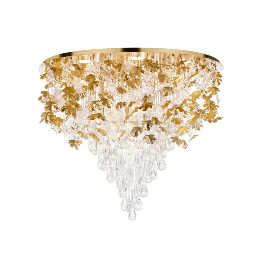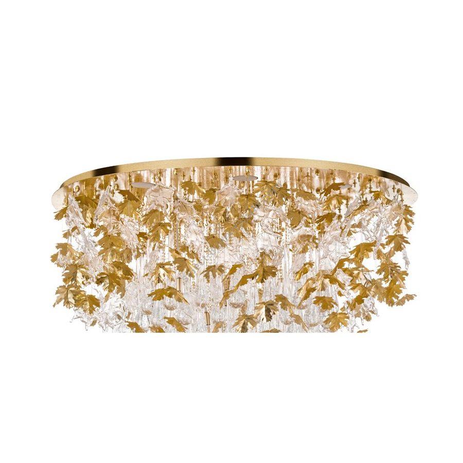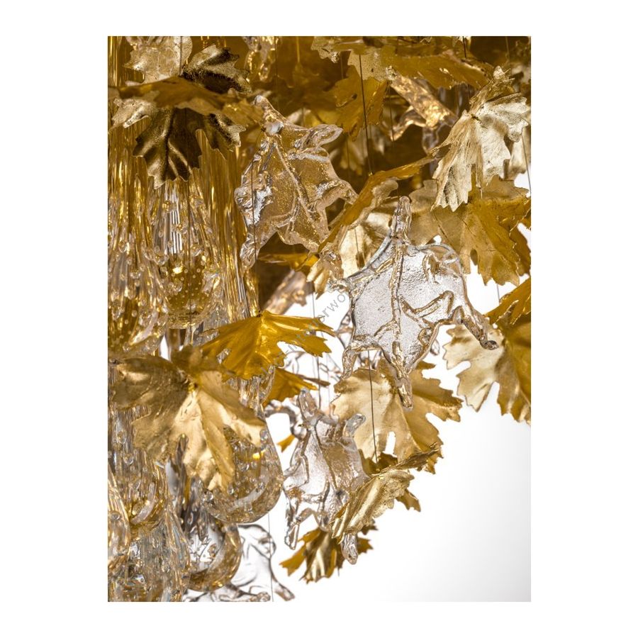 The spectacular cascading chandelier with metal and glass maple leaves, featuring a gold leaf finish, is a luminous masterpiece of extraordinary beauty and luxury. The main structure, coated in gold leaf, shines with elegance. The intricately detailed metal maple leaves merge with a cascade of Murano glass pendants at the center. The overall effect is one of pure magnificence, with play of light and reflections that create a magical atmosphere. A sumptuous and captivating piece of furniture that adds sophistication and splendor to any space.