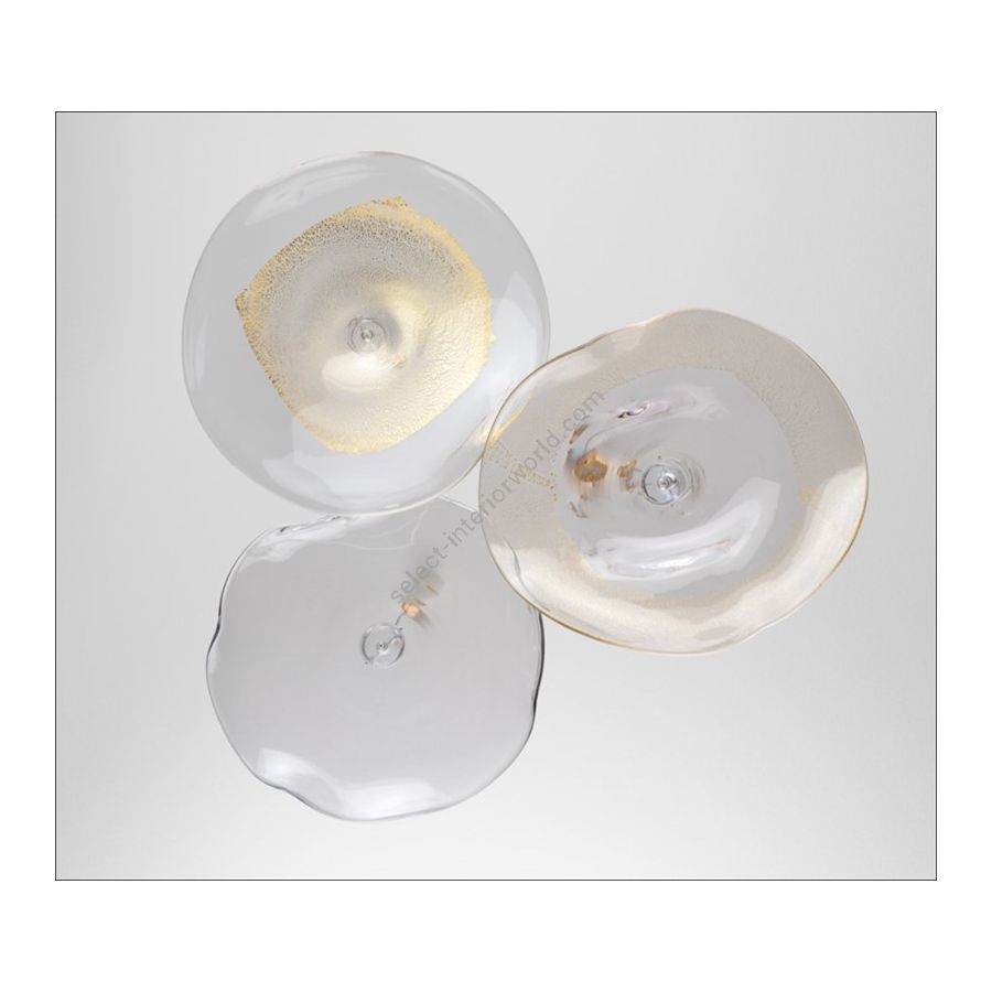The chandelier is an elegant fusion of transparent and gold Murano glass discs, mounted directly to the ceiling without any visible metal plate. The transparency of the discs provides lightness and brightness, while the gold adds a touch of warmth. The suspended design creates an ethereal atmosphere, highlighting the beauty of the materials without metallic interferences. It is a luminous work of art that combines luxury and sophistication in ambient lighting.