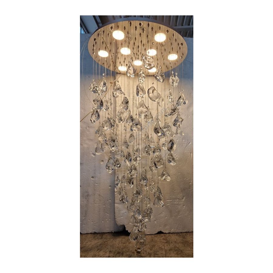 The cascading chandelier is a scenographic work of art that immediately captures attention thanks to its unique and elegant design. Composed entirely of ice-effect crystal, this chandelier creates a harmonious and spectacular play of light, illuminating the environment with timeless elegance. In summary, the cascading chandelier with ice-effect crystal is a unique piece of furniture, capable of enhancing any space with its beauty and breathtaking light. 120 Crystall ice
