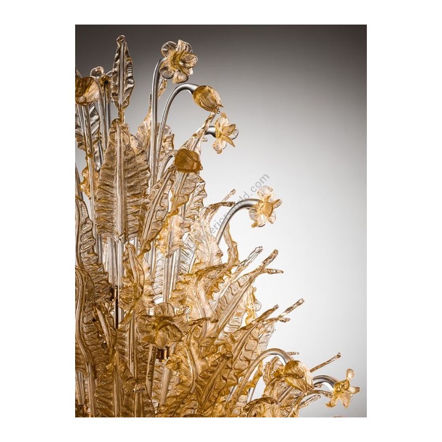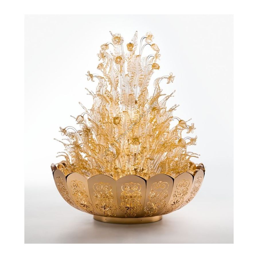 Spectacular and giant floor lamp suitable for entrance or center room covered with perforated metal bowl with 24k gold bath and blown Murano glass with 24K gold decoration. Lighting item that diffuses the light with great effect in the surrounding environement creating a warm and welcoming atmosphere.
