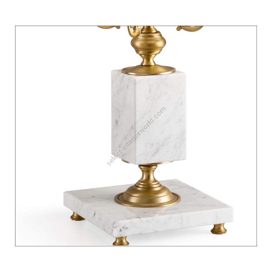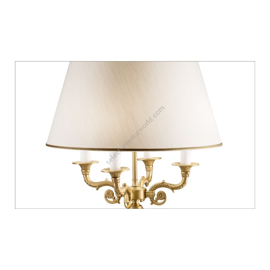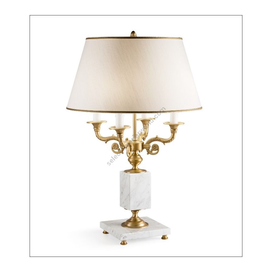 An Empire-style lamp with a white Carrara marble base and brass components, complete with an ivory shantung lampshade, can be customized for both the type of marble and the lampshade fabric. This piece of furniture embodies elegance and luxury, diffusing a soft light and creating a cozy atmosphere.