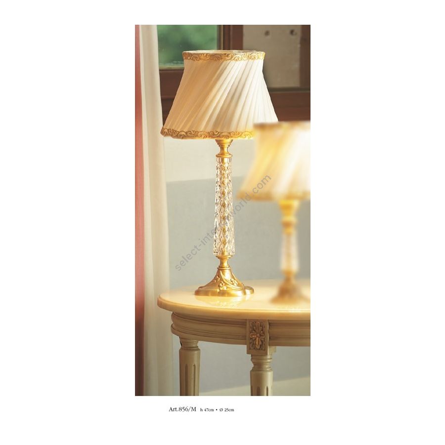 Table Lamp with crystal cut by hand and fabric lampshade. Lighting item that diffuses the light with great effect in the surrounding environement creating a warm and welcoming atmosphere.