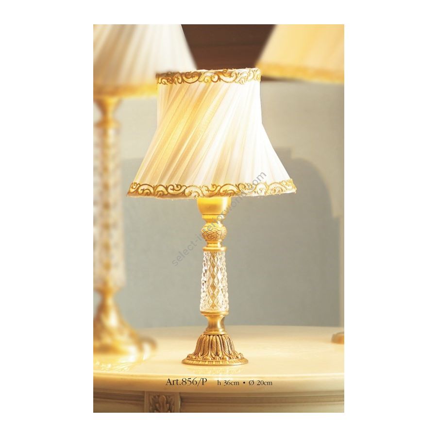 Table Lamp with crystal cut by hand and fabric lampshade. Lighting item that diffuses the light with great effect in the surrounding environement creating a warm and welcoming atmosphere.