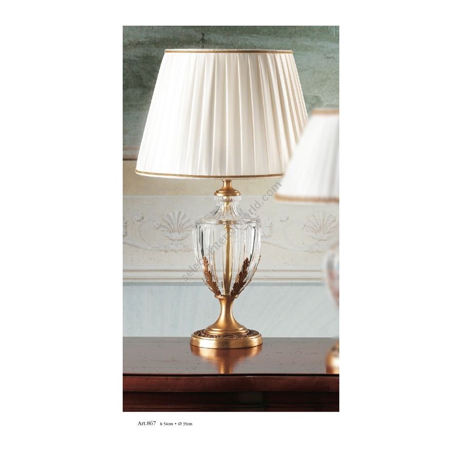 Table lamp in Florentine crystal with silk pleated lampshade. Lighting item that diffuses the light with great effect in the surrounding environement creating a warm and welcoming atmosphere.