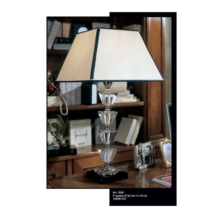 Table lamp with square crystals and shade. Lighting item that diffuses the light with great effect in the surrounding environement creating a warm and welcoming atmosphere.