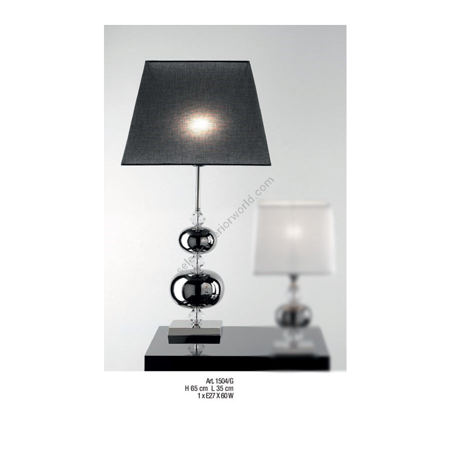 Table lamp with nikel spheres and cristals. Lighting item that diffuses the light with great effect in the surrounding environement creating a warm and welcoming atmosphere.
