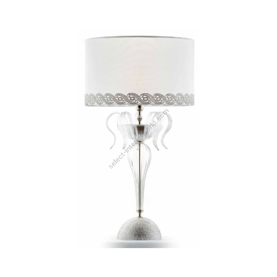 NINFEA Collection Table Lamp in Murano glass with brass elements inlaid with Swarovski® strass crystals. Included lampshade in white organza with fabric trimming. Lighting item that diffuses the light with great effect in the surrounding environement creating a warm and welcoming atmosphere.
