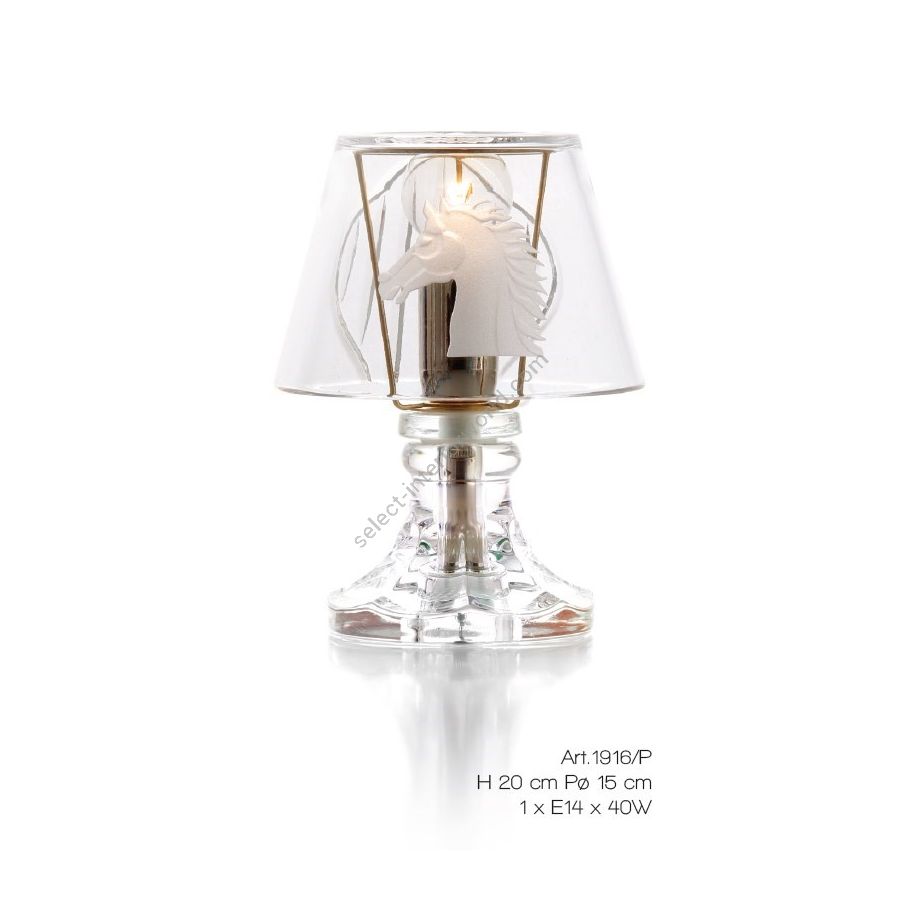 Table lamp in Florentine Crystal with engraved horse. Lighting item that diffuses the light with great effect in the surrounding environement creating a warm and welcoming atmosphere.