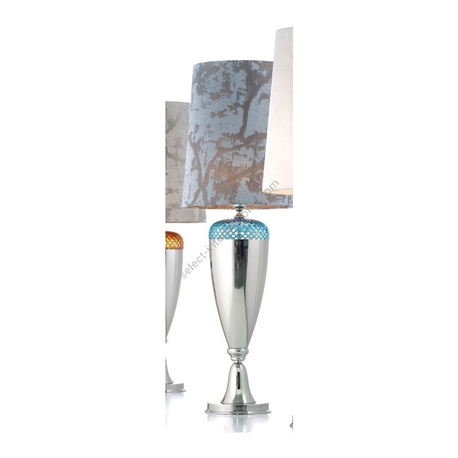 Table lamp with coloured Crystal and double switch. Lighting item that diffuses the light with great effect in the surrounding environement creating a warm and welcoming atmosphere.