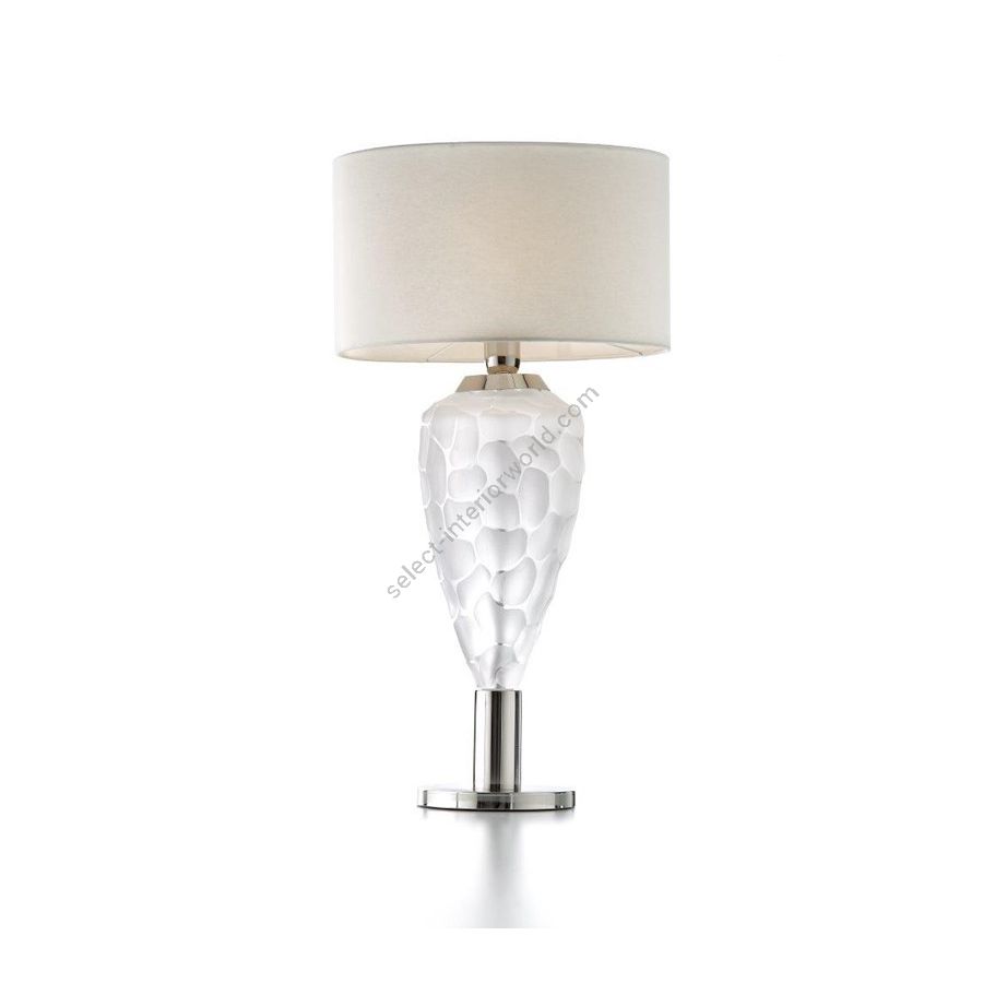 Table lamp in shiny and matt clear Italian crystal hand-cut and white fabric lampshade on pvc. Metal parts in Nikel finishing. Lighting item that diffuses the light with great effect in the surrounding environement creating a warm and welcoming atmosphere.