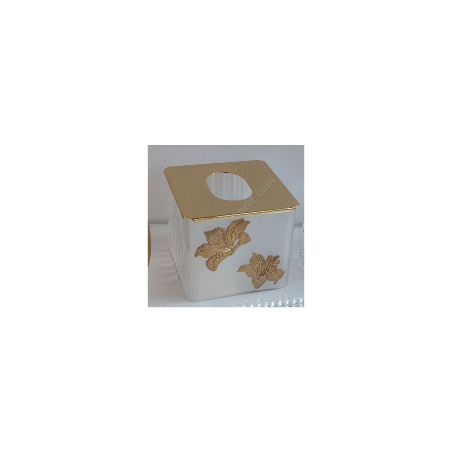 Tissue box in italian hand-cutted crystal with golden lilies. Functional elements that create an extremely elegant, welcoming and high-value bathroom.