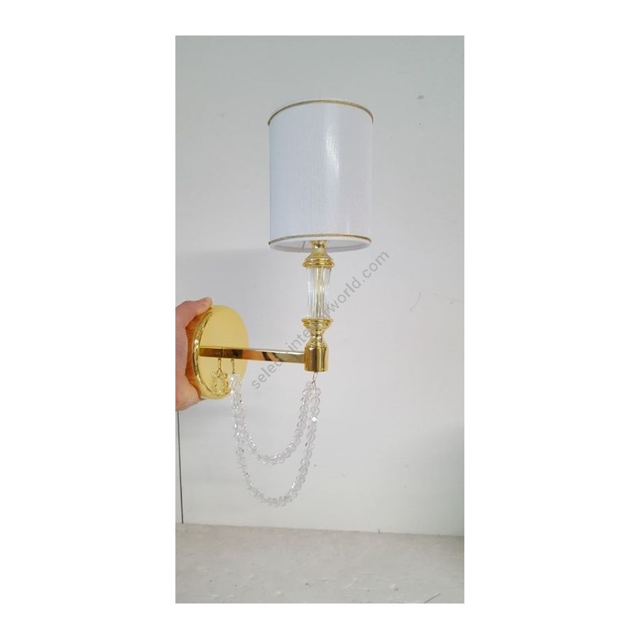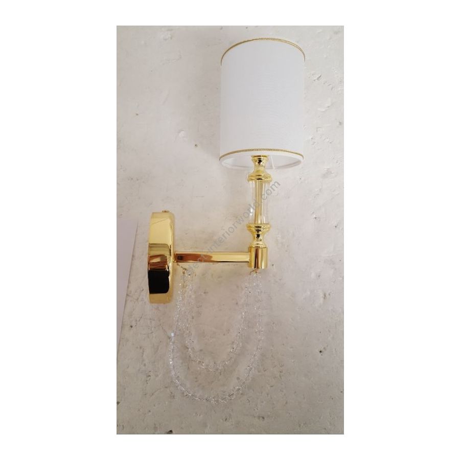 Wall lamp in brass with rows of crystal pearls. Lampshades in white shiny organza on pvc with gold thread trimming. Lighting item that diffuses the light with great effect in the surrounding environement creating a warm and welcoming atmosphere.