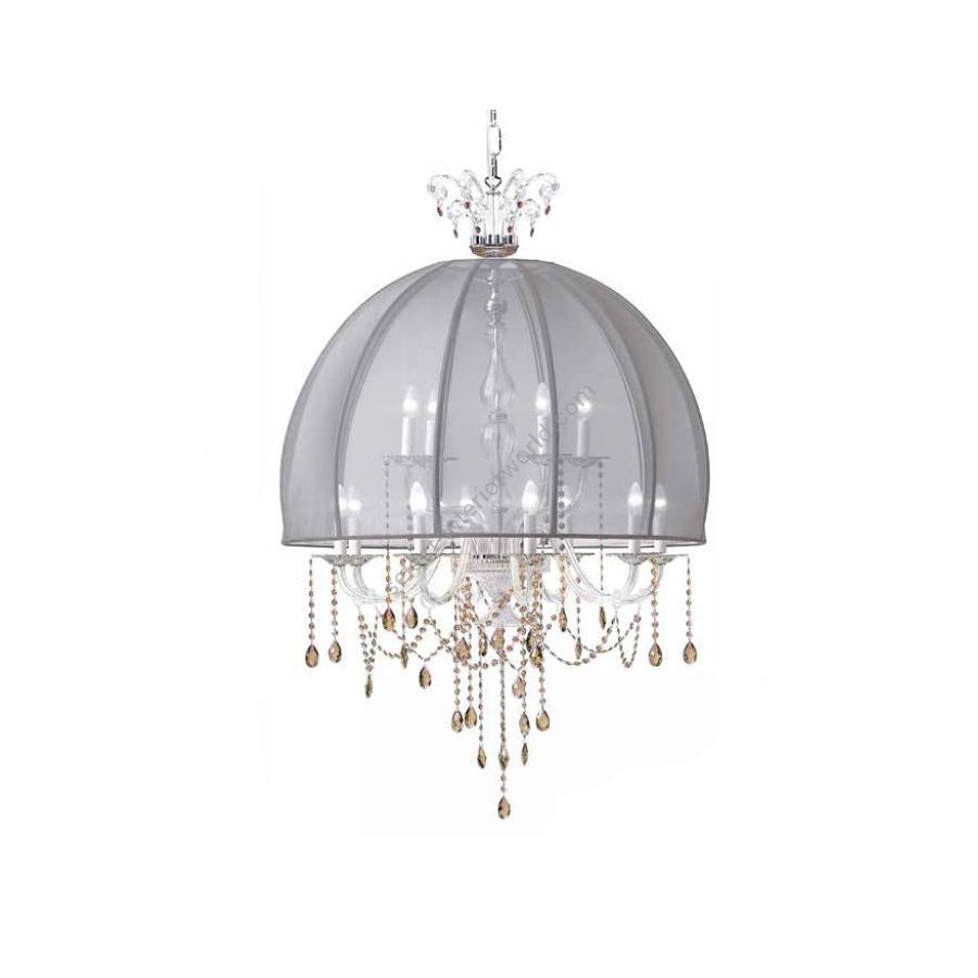 Clear glass chandelier in Mariateresa style with crystal pendants and lampshade in organza fabric. Lighting item that diffuses the light with great effect in the surrounding environement creating a warm and welcoming atmosphere.