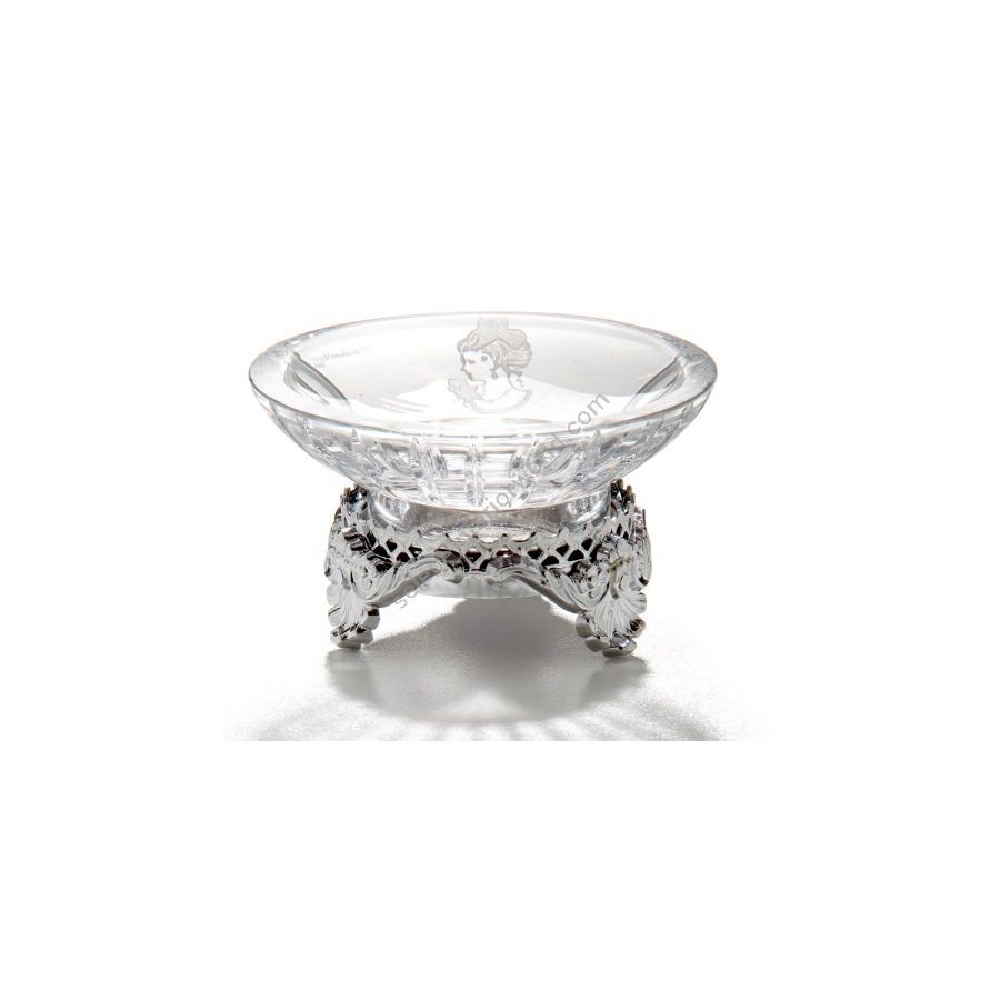 Soap dishes in clear Italian crystal with hand-carved lady portrait cameo and chrome brass element base. Functional elements that create an extremely elegant, welcoming and high-value bathroom.