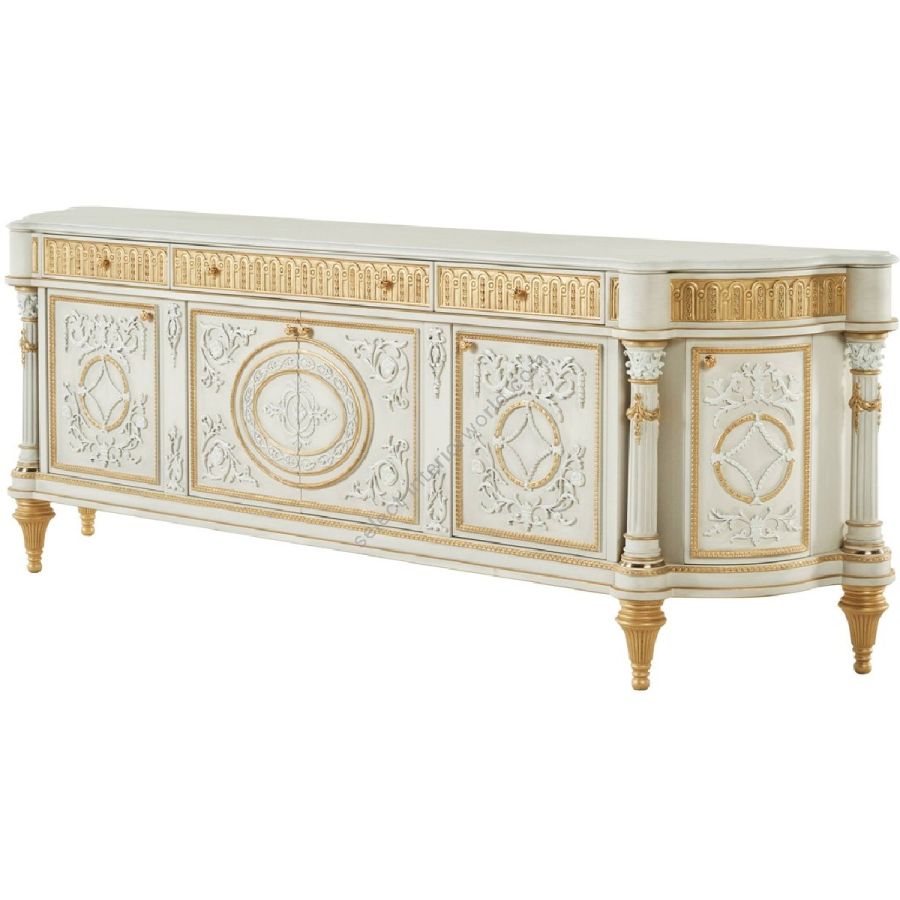 A stately and charming piece of furniture, the Bohme sideboard is a masterpiece that encapsulates all the expertise of Jumbo Collection's master carvers. Neoclassical columns frame finely carved decorative elements, accentuated by hand-applied gold leaf decoration. Bohme celebrates Made in Italy with a classic, refined Jumbo Collection unmistakable style.