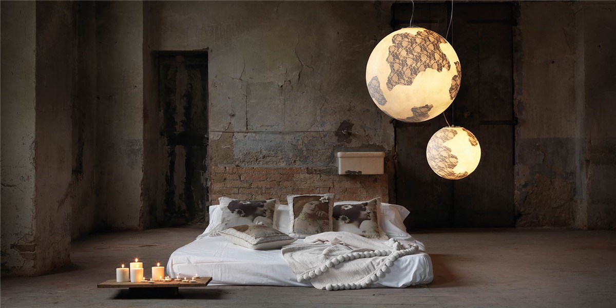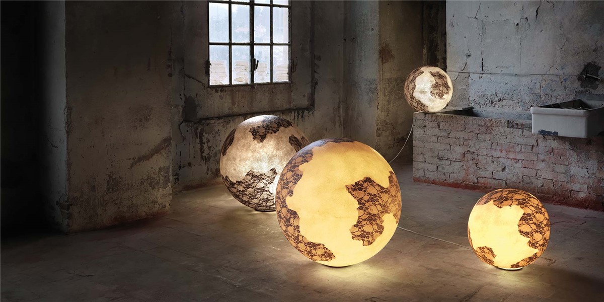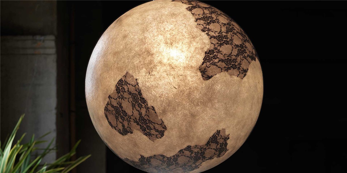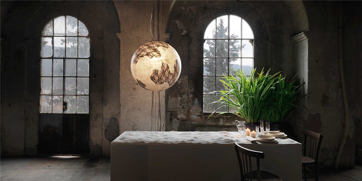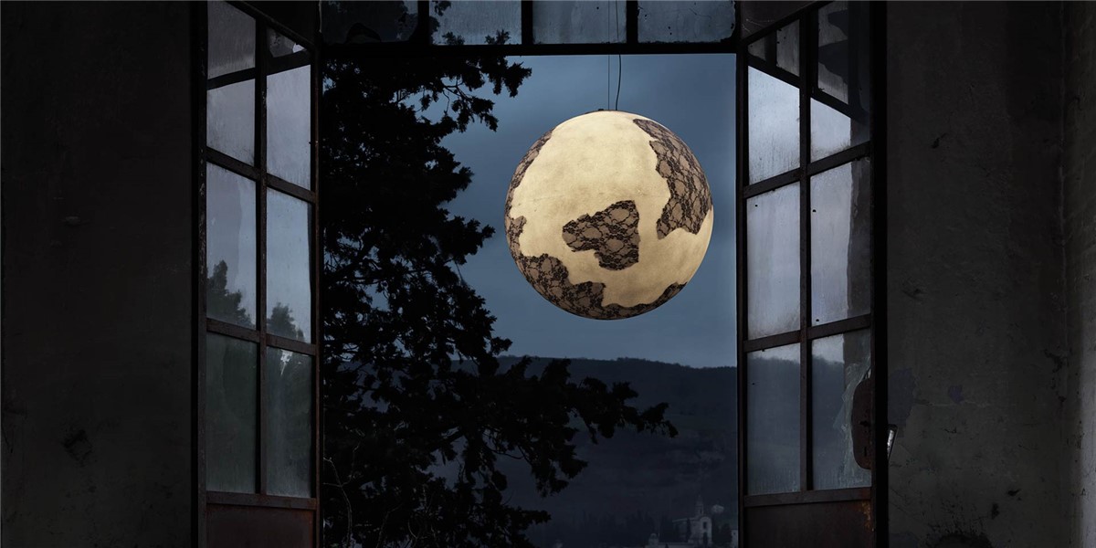 The evocative power of the moon transforms into suspension and floor lamps. The white fiberglass sphere is covered with macramé fabric, creating a bright and poetic piece of furniture. Suspended, placed on the ground, or in the middle of a meadow, Ululì and Ululà come to life when lighted on, creating warm amber tones. Small (Ululì) and large (Ululà) versions can be used indoor and outdoor.