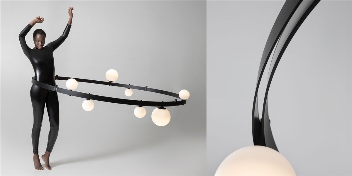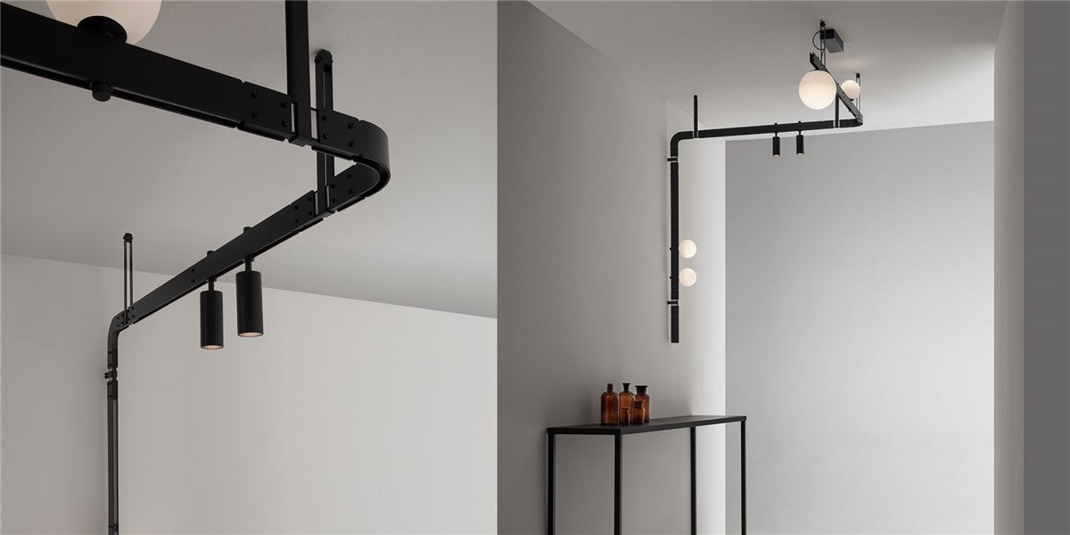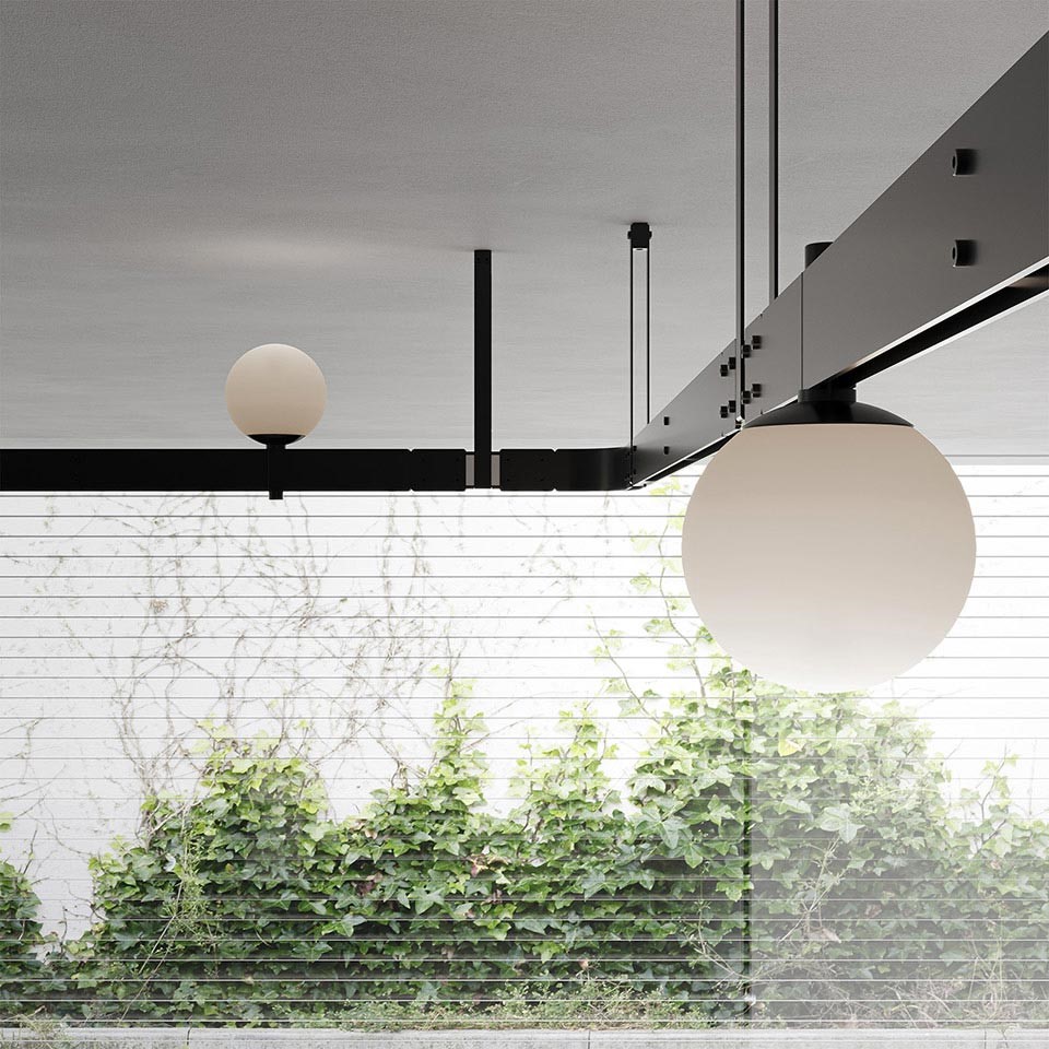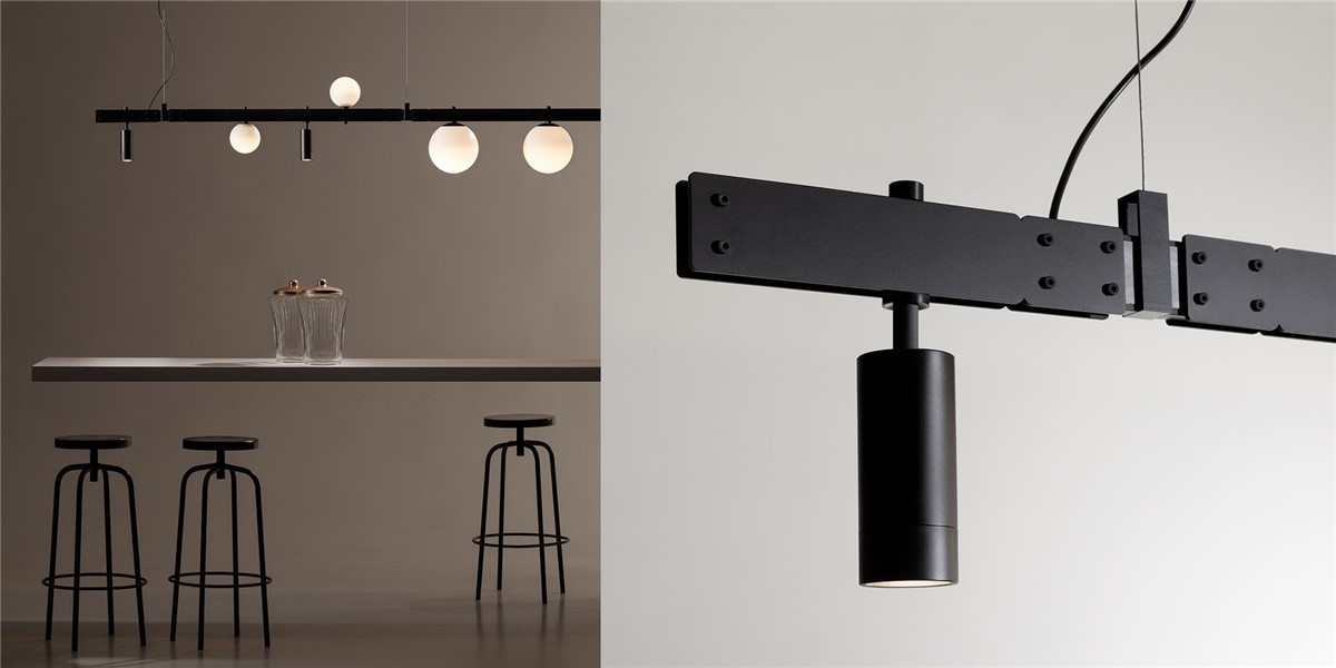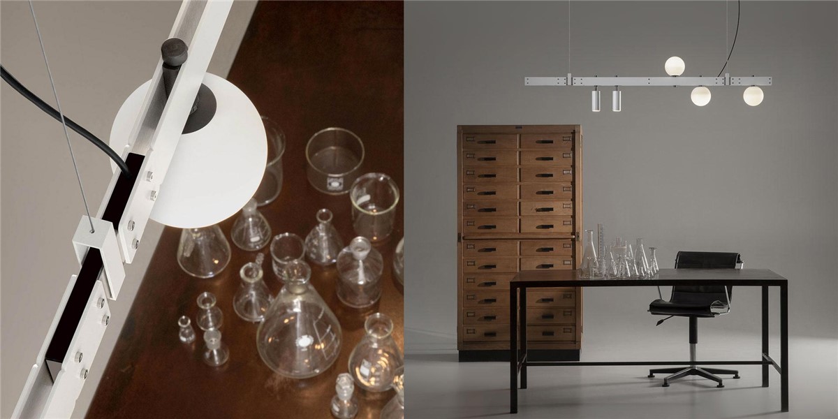 Stant, a series of extremely diverse suspension and ceiling lamps built using straight and curved lines, namely the fundamentals of geometry. Freely inspired by the italian participle “Stante” of the verb Stare, the collection consists of linear and static shapes in aluminum painted in white or black, recalling the engineering structures of the first ‘900. All components are clearly visible, assembled with pins, into which elements such as cylindrical spotlights in two sizes or satin glass spheres in two different diameters can be freely inserted. By adding elements without the need for addition power cables, everyone is free to create a micro-light architecture and generate a small personal universe.