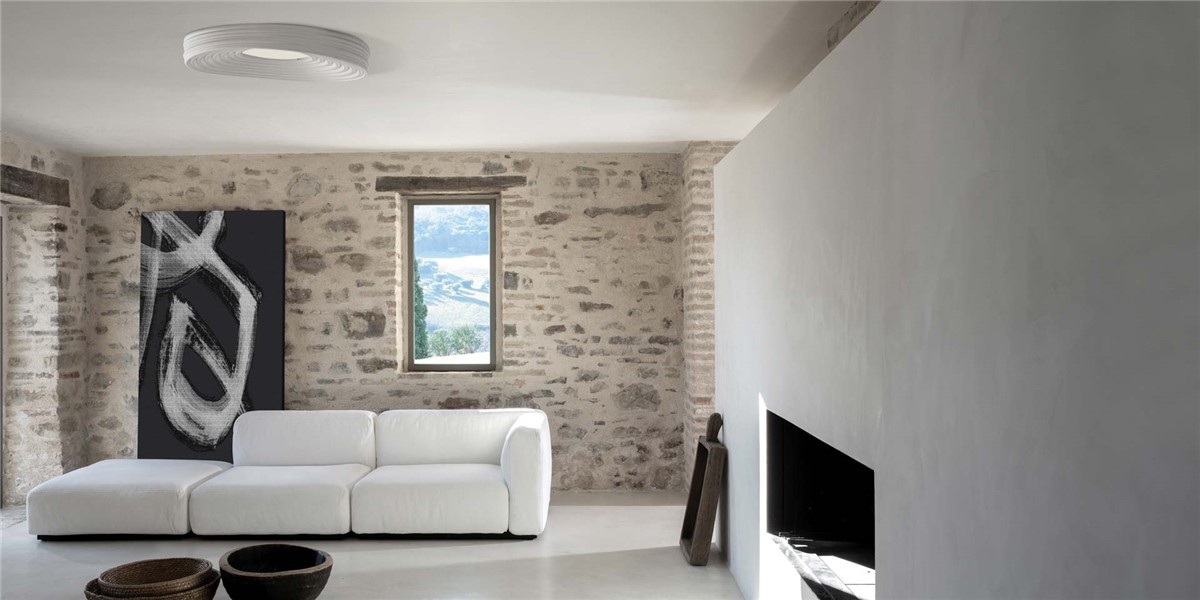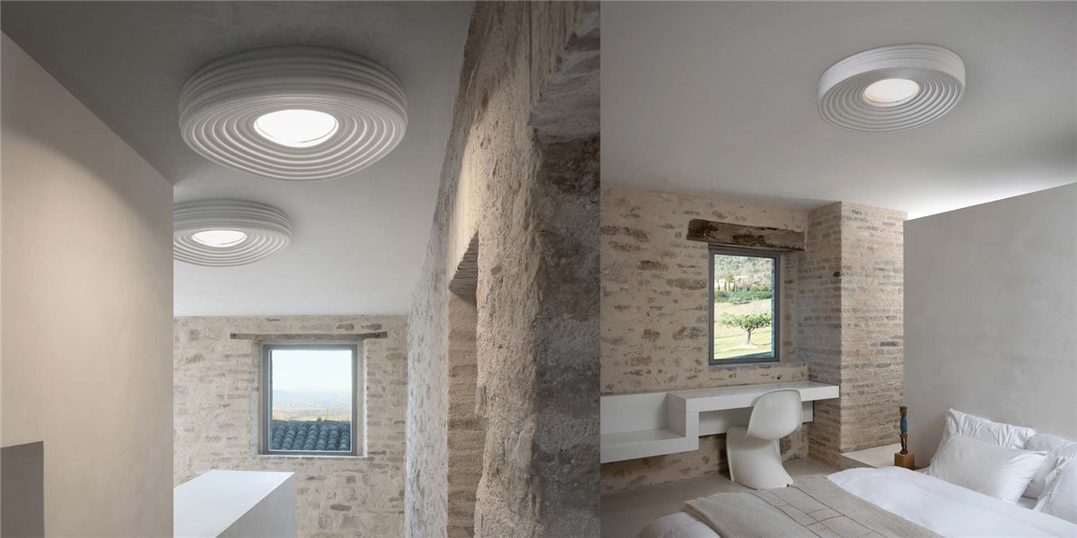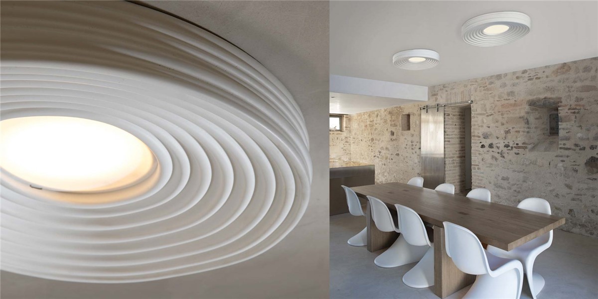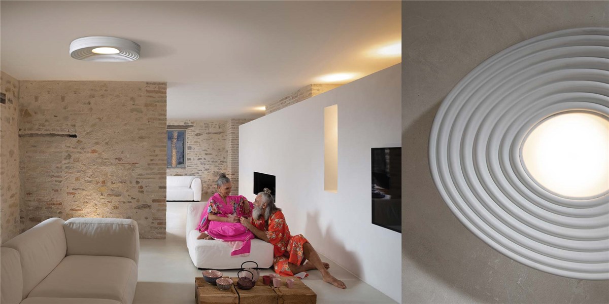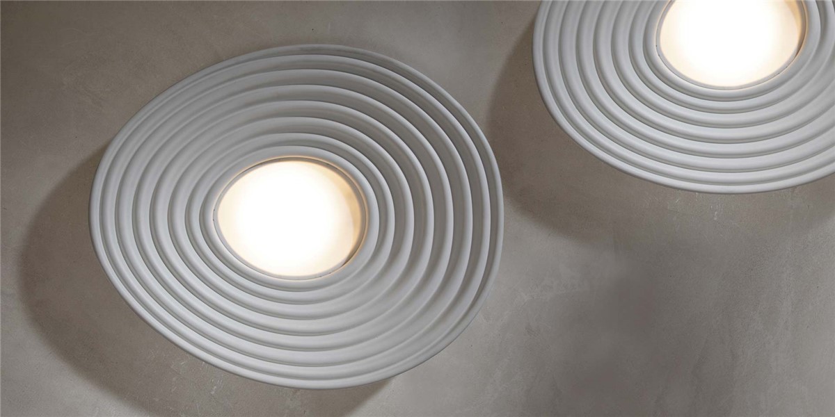 This ceiling light is made of matt white plaster and allows the user to redifine spaces in the house in a whirlpool of materials designed by light. A central fulcrum ensures direct illumination, which propagates and reflects concentrically on the lamp’s surface.