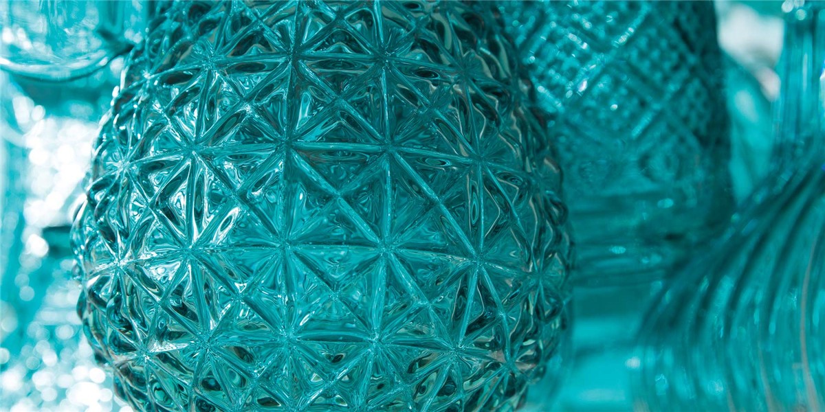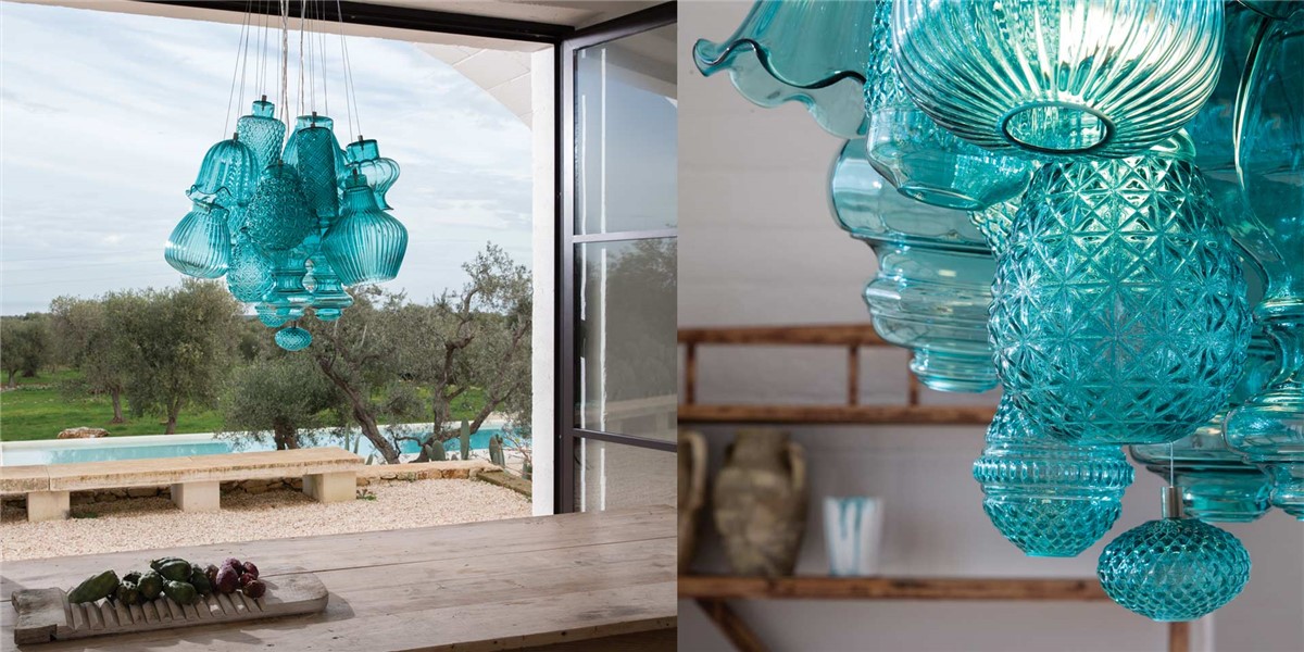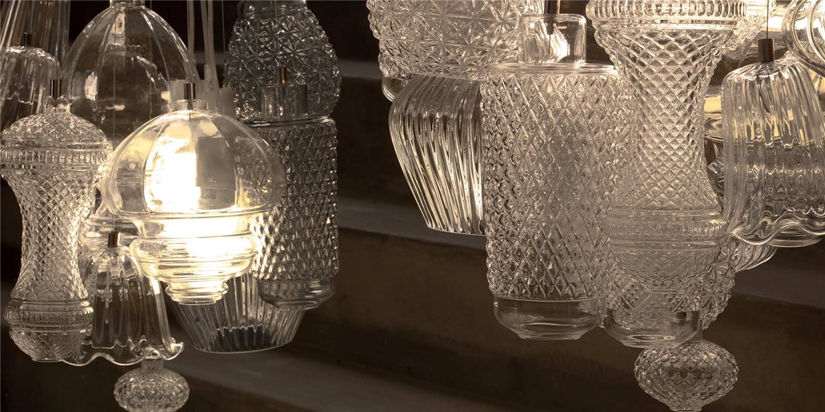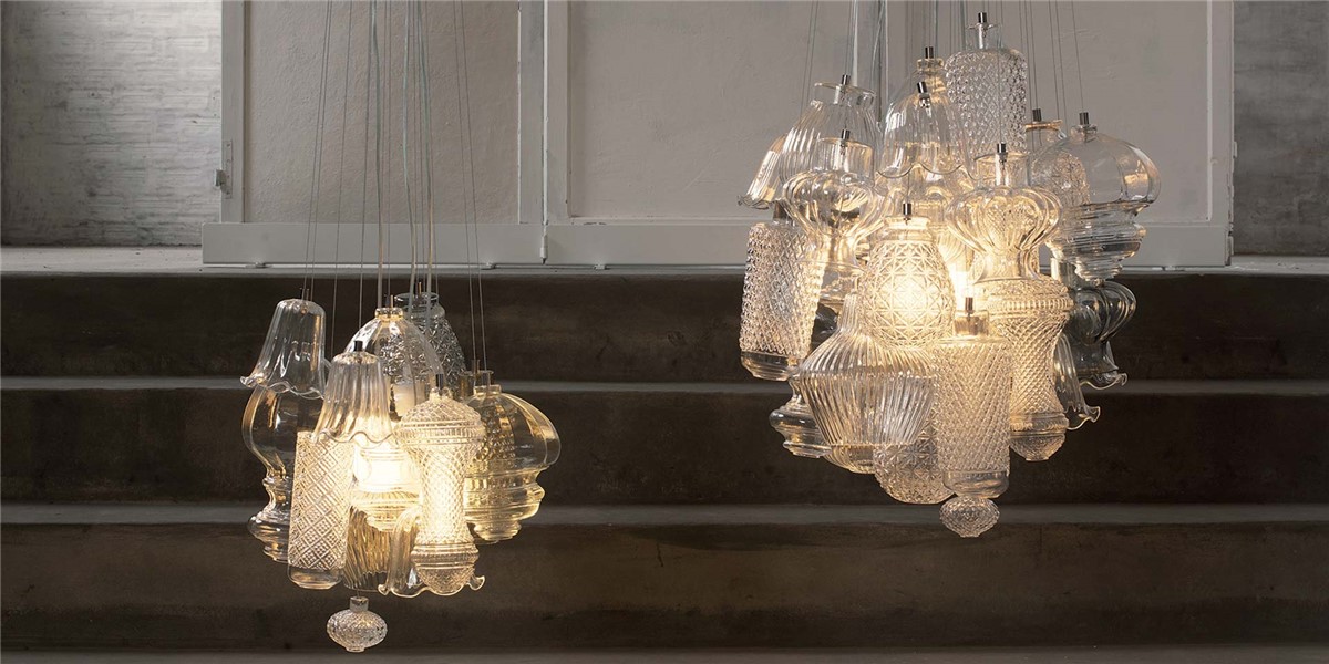 Like a chorus of bells or a bouquet of spring flowers, Ceraunavolta mixes 12 different lampshades, each with its own special treatment and decoration. These lampshades are made of transparent or polished blue Tiffany glass, using the original molds from the 1970s.