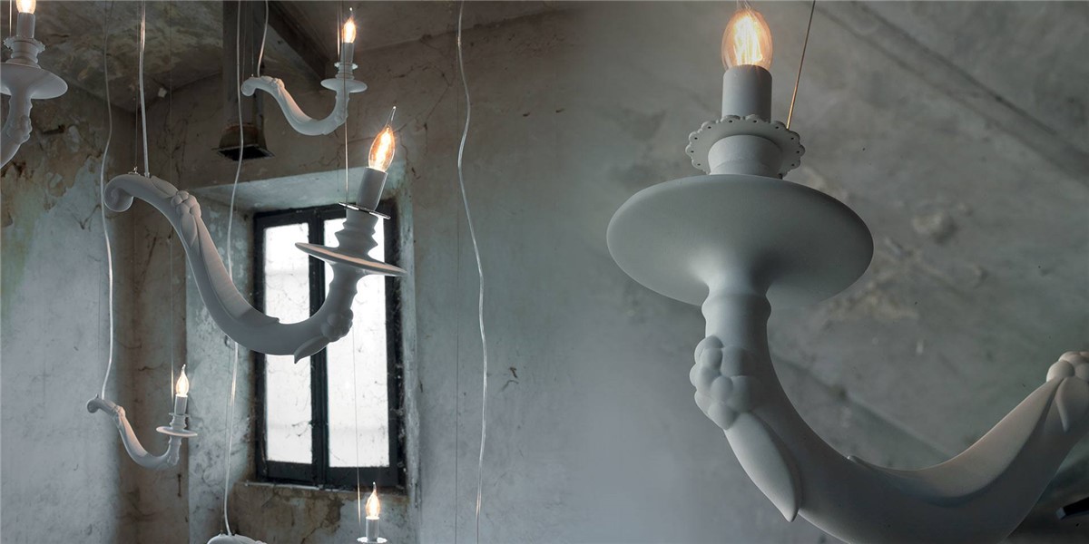 Einarmige Leuchte aus Keramik, ohne Lampenschirme, aus glänzender weißer oder satinierter Keramik, bedeckt mit Akanthus-Keramikblättern, schmückt den Raum in Form von zwei unterschiedlich großen Aufhängungen, einzeln oder in Gruppen.