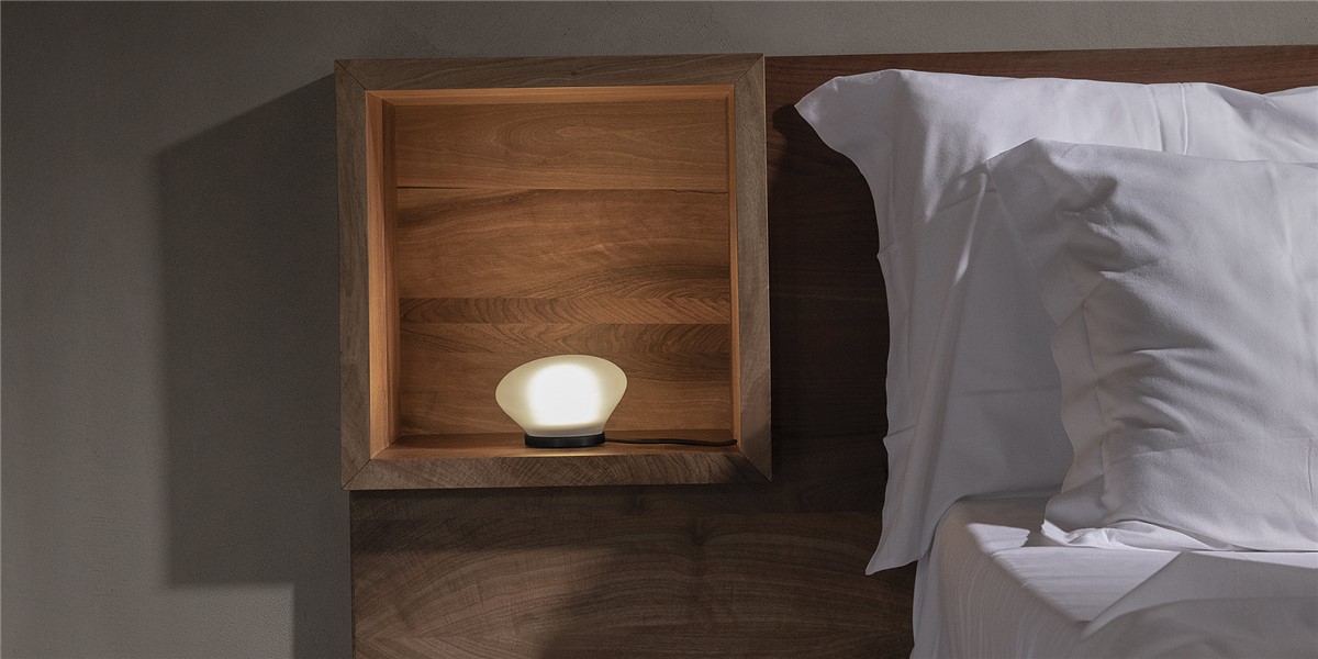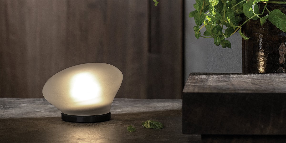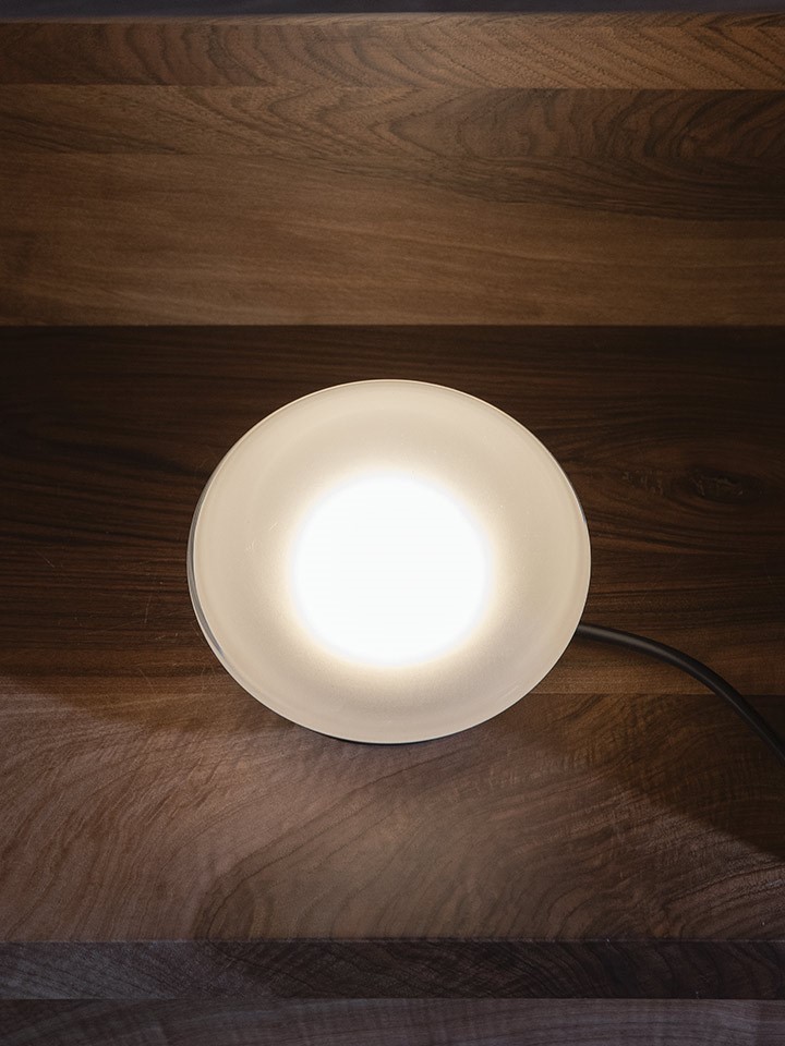 A circular shaped, mouthblown, thick glass spot, transparent or satin-finished. Agua can be used as a table or wall lamp to createa a halo on a wall or other reflective surface. The base is in black anodized aluminum with an internal cap diffuser to protect the LED light source. It can be placed in geometric or random patterns, as a one-point light on a side table, or in a hidden corner of the house or garden.