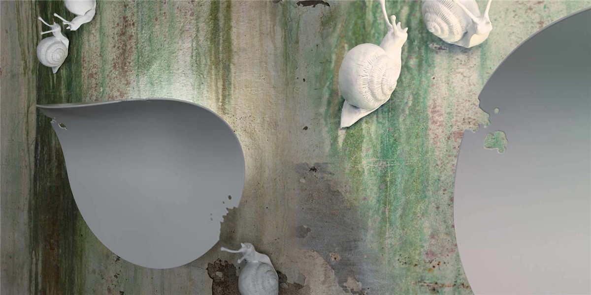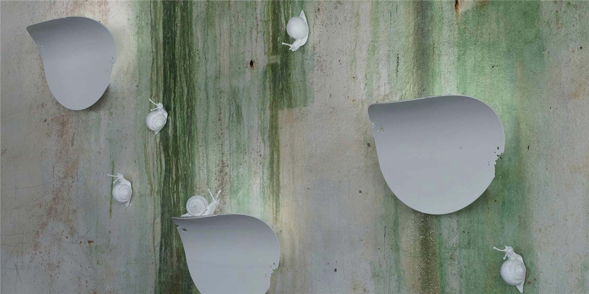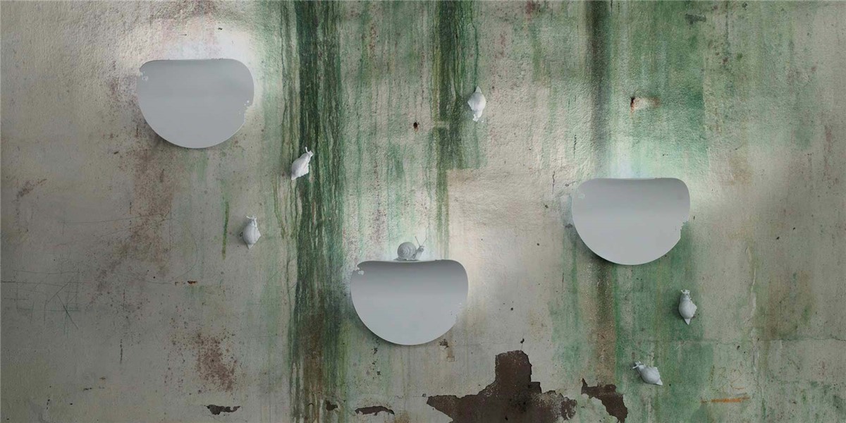 A snail takes refuge beneath an applique in the shape of a large leaf bent and chewed around the edges. The structure is in white lacquered aluminum and the snail is in white ceramic, and several of them can be combined to customize the wall.