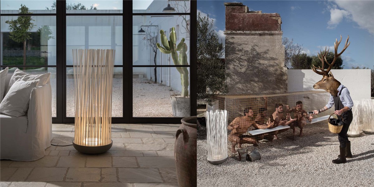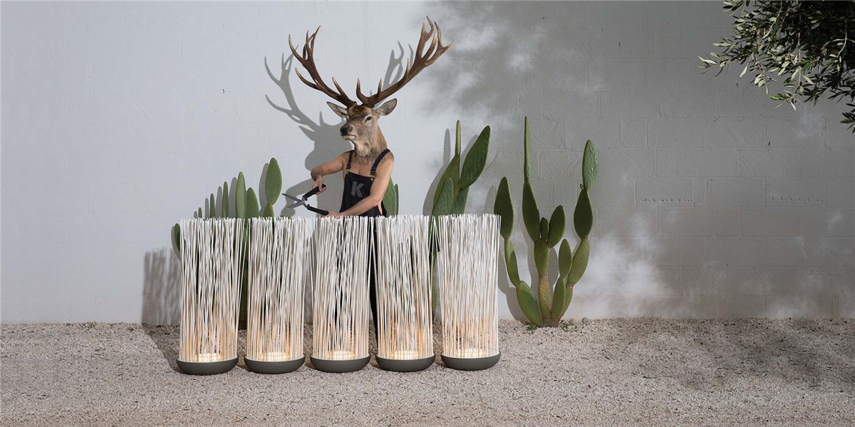 From a hemispherical base made of grey technopolymer, many luminous stems made of soft-touch white PVC are housed in a floating shank that attracts the desire for light and at the same time demands us to touch it. The floor lamp can be used both outdoor and indoor, and thanks to the O-ring, the rods can almost collect the rays of light.