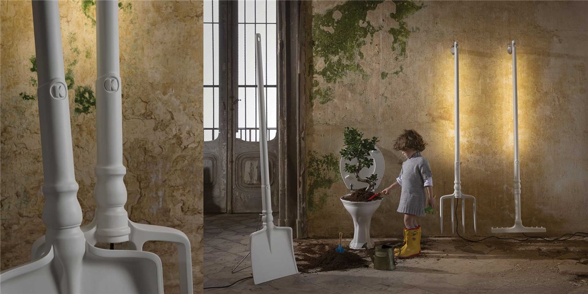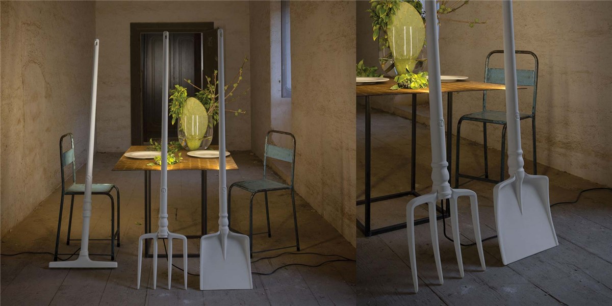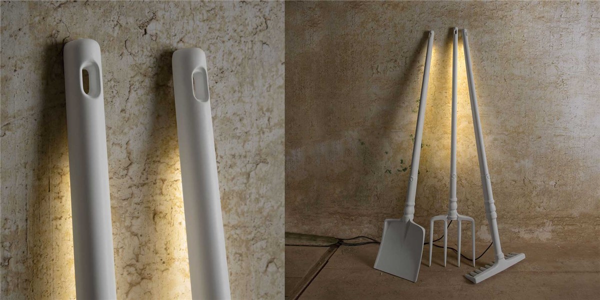 Spade, Pitchfork and Rake become original lights that can be used indoor and outdoor. Based on the imagination of rural peasants, they are reinterpretations of everyday work tools, with typical shapes modeled in a matt white technopolymer. Along the handle, an undirect LED strip directly illuminates the surface on which the lamp is placed. It can be hung with a wall hook in brushed steel, or with a steel pedestal that can make the lamp stand on its own.