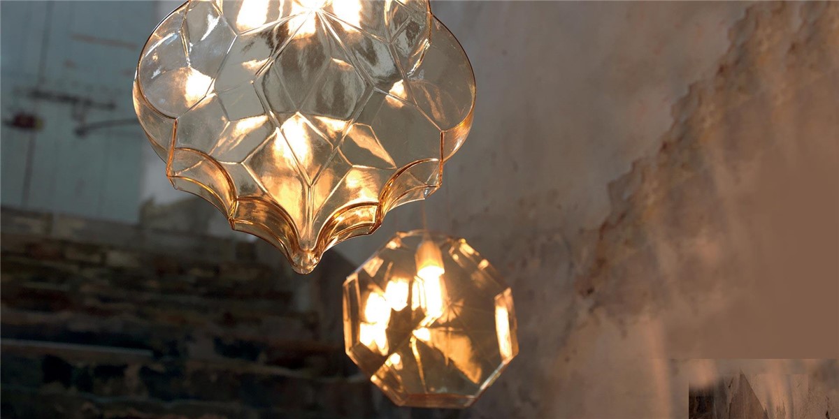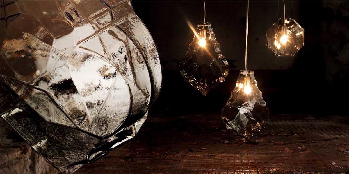 With the skillful craftsmanship of smoked or pale yellor glass to replicte the cut of gemstones, 24 Karati sparkling suspensions are available in drop or hexagonal shapes. This unique combination of three-dimensional shapes,which not only reflect light but also glow, can be enjoyed on their own or in clusters.