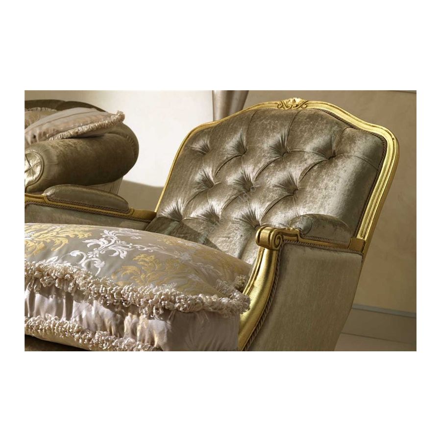 Armchair with a semiremovable seat covering. Beechwood structure with hand-carved parts. Non-deformable polyurethane foam cuschion. Pillows with goose feathers. Golden, silver or copper leaf is available upon request at extra charge.