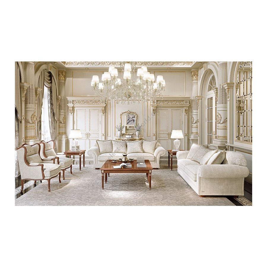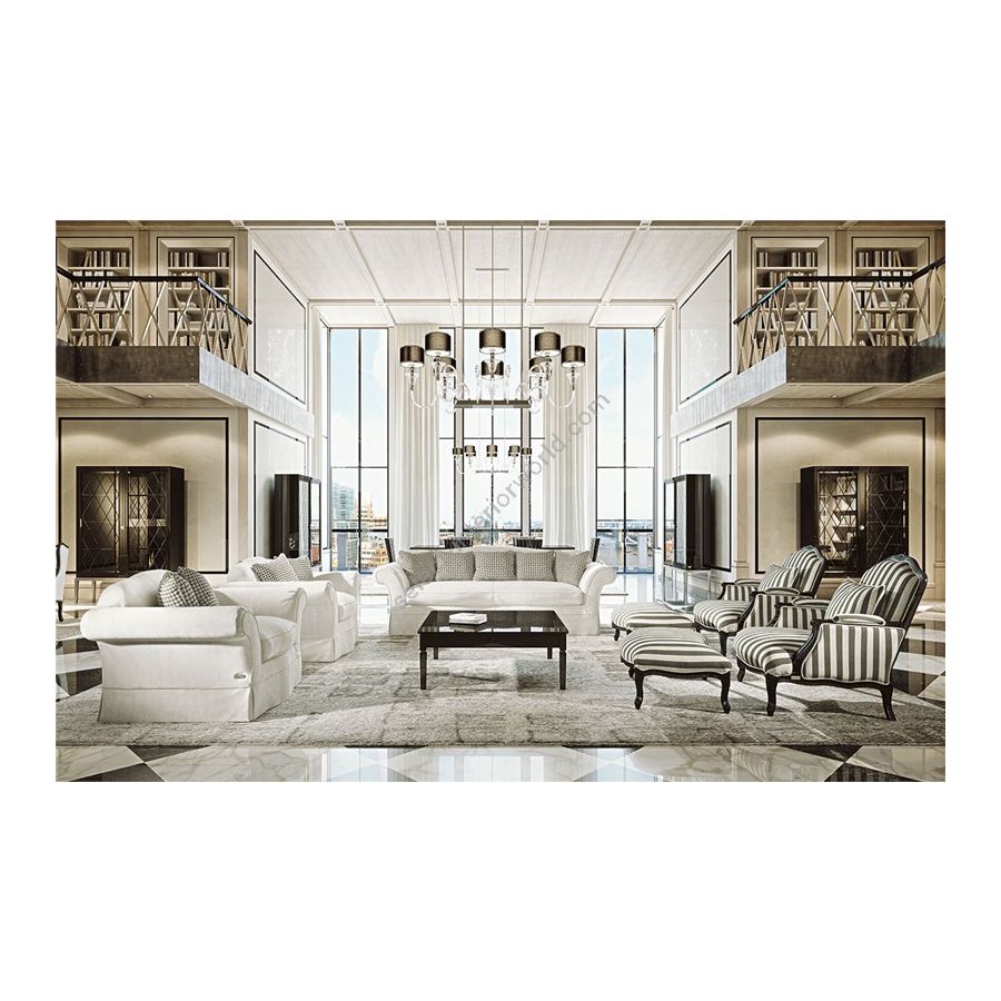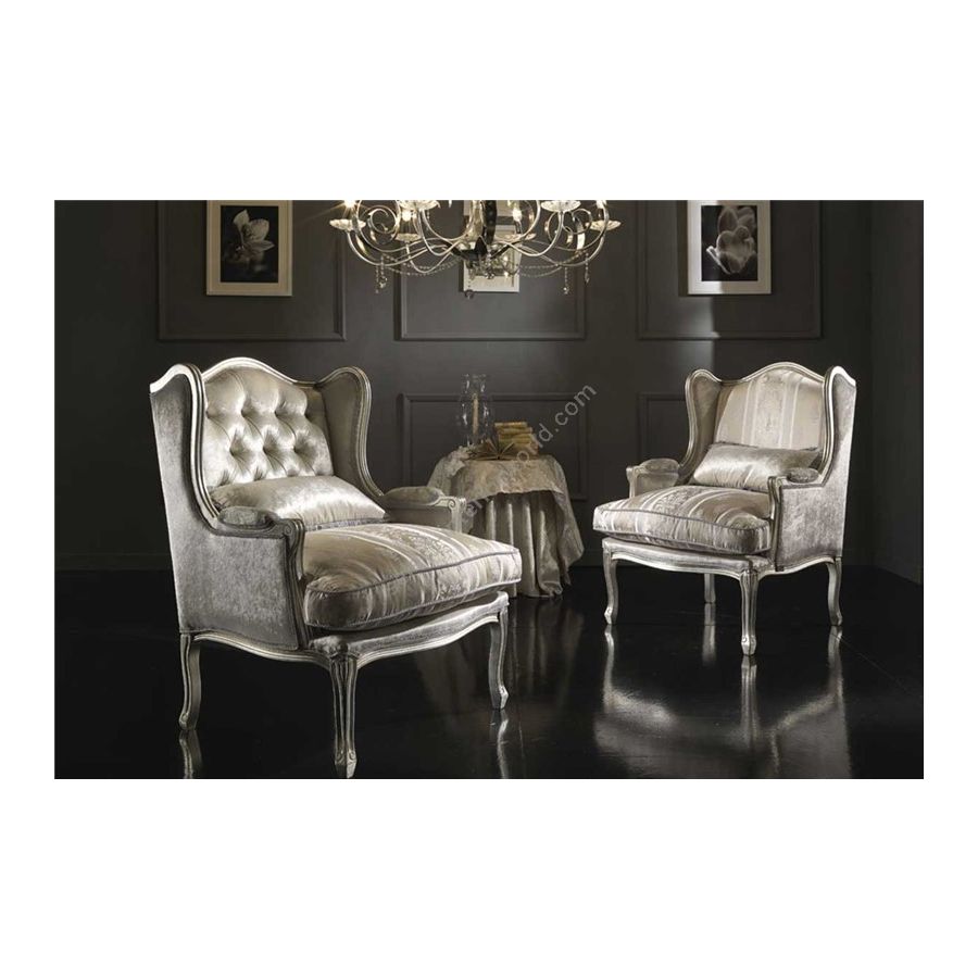 Hand-finished beechwood structure. Non-deformable polyurethane foam cushion. Seat and backrest cushions with goose feathers. Golden, silver or copper leaf is available upon request at extra charge. An additional price is to be paid for the capitonné upholstery buttoning model as indicated in the price list.